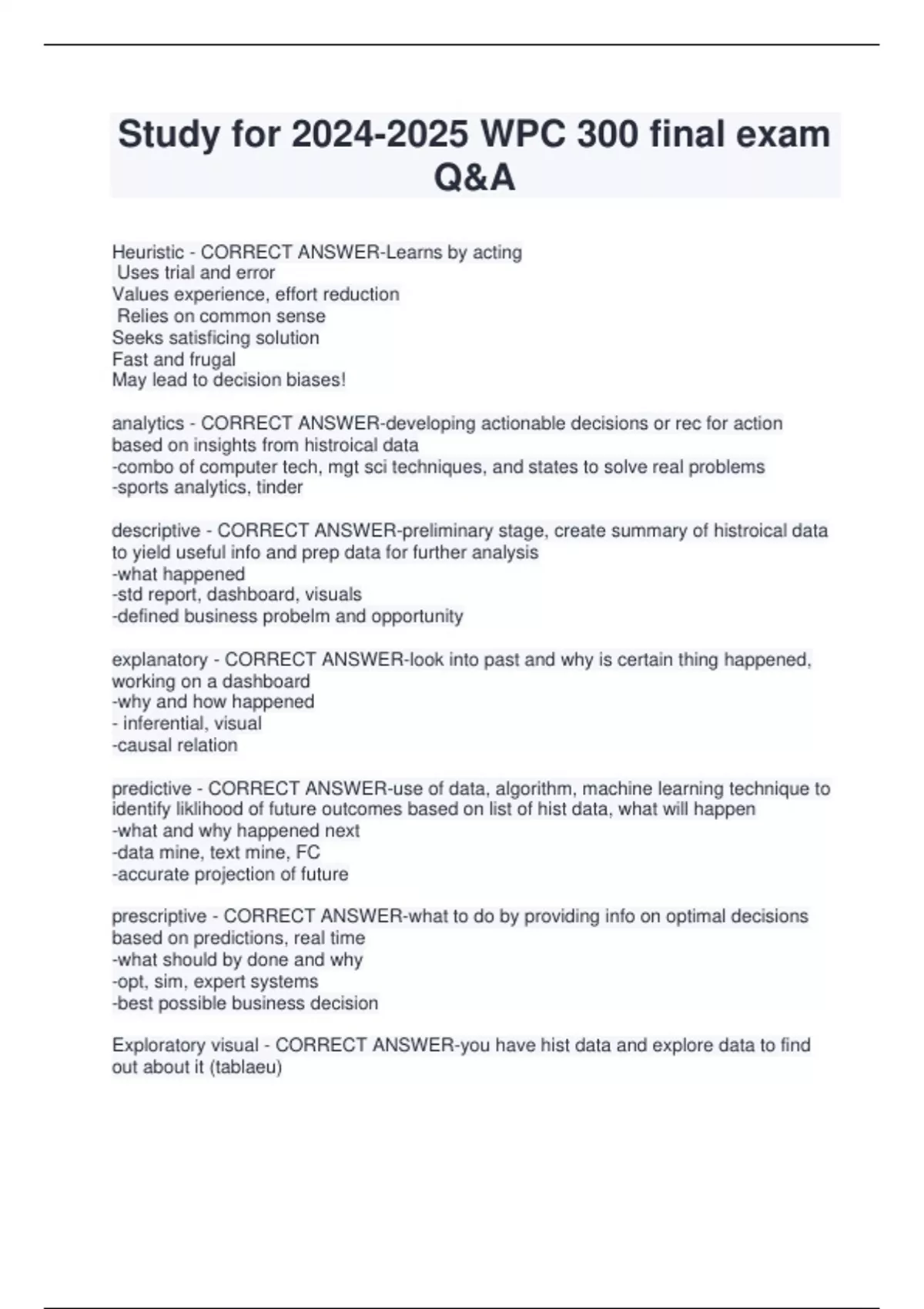 Study for WPC 300 final exam Q&A Heuristic - CORRECT ANSWER-Learns by acting Uses trial and error Values experience, effort reduction Relies on common sense Seeks satisficing solution Fast and frugal May lead to decision biases! analytics - CORRECT ANSWER-developing actionable decisions or rec for action based on insights from histroical data -combo of computer tech, mgt sci techniques, and states to solve real problems -sports analytics, tinder descriptive - CORRECT ANSWER-preliminary stage, create summary of histroical data to yield useful info and prep data for further analysis -what happened -std report, dashboard, visuals -defined business probelm and opportunity explanatory - CORRECT ANSWER-look into past and why is certain thing happened, working on a dashboard -why and how happened - inferential, visual -causal relation predictive - CORRECT ANSWER-use of data, algorithm, machine learning technique to identify liklihood of future outcomes based on list of hist data, what will happen -what and why happened next -data mine, text mine, FC -accurate projection of future prescriptive - CORRECT ANSWER-what to do by providing info on optimal decisions based on predictions, real time -what should by done and why -opt, sim, expert systems -best possible business decision Exploratory visual - CORRECT ANSWER-you have hist data and explore data to find out about it (tablaeu) confirmatory visual - CORRECT ANSWER-expect correlation and look at visual to confirm production visual - CORRECT ANSWER-know to look for because understand problem, usually used to find problems -dashboard spatial data visual - CORRECT ANSWER-color coded map dynamic visual - CORRECT ANSWER-graph video shows data changes through the years Tufte's principles of data visualization - CORRECT ANSWER--The chart should tell a story -The chart should have graphical integrity -The chart should minimize graphical complexity Lie Factor - CORRECT ANSWER-size of effect shown in graphic / size of effect in data should roughly equal 1 Lie Factor 1: Understated effect Lie Factor 1: Exaggerated effect Data-ink ratio - CORRECT ANSWER-(data-ink)/(total ink used to print the graphic) should roughly equal 1 DIR ≪ 1, more non-data related info present in chart DIR ≫ 1, less non-data related info present in chart DIR = 1, all ink devoted to present the data in chart chartjunk - CORRECT ANSWER-any unnecessary information or feature in a graph that detracts from a viewer's ability to understand the data -When the data-ink ratio is low, chartjunk is likely to