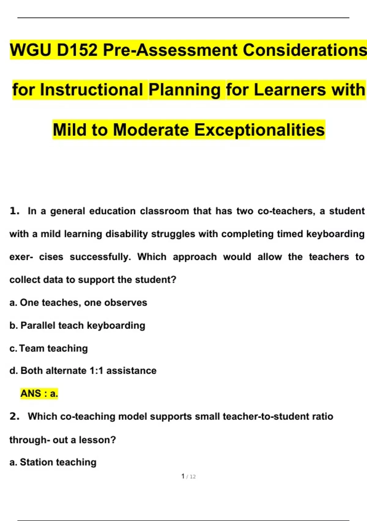 WGU D152 Pre-Assessment Considerations for Instructional Planning for Learners with Mild to Moderate Exceptionalities 2024 Questions and Answers 2024 / 2025 (Verified Answers by Expert)