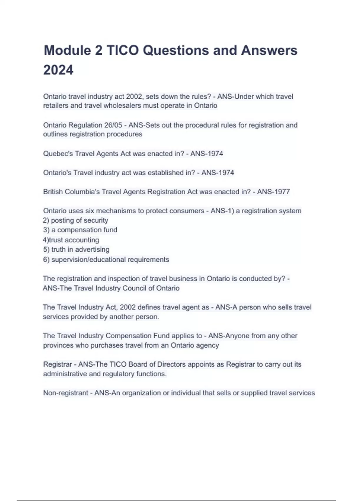 Ontario travel industry act 2002, sets down the rules? - ANS-Under which travel