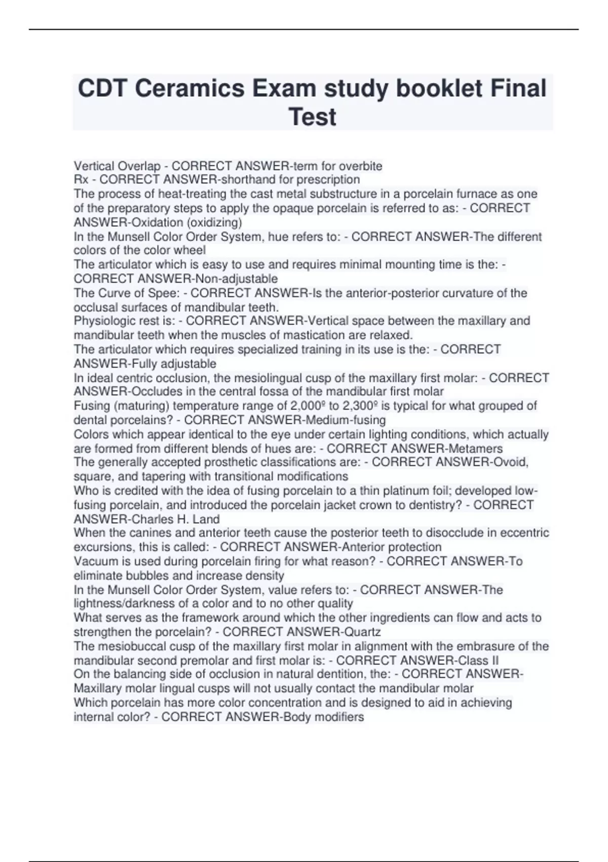 CDT Ceramics Exam study booklet Final Test Vertical Overlap - CORRECT ANSWER-term for overbite Rx - CORRECT ANSWER-shorthand for prescription The process of heat-treating the cast metal substructure in a porcelain furnace as one of the preparatory steps to apply the opaque porcelain is referred to as: - CORRECT ANSWER-Oxidation (oxidizing) In the Munsell Color Order System, hue refers to: - CORRECT ANSWER-The different colors of the color wheel The articulator which is easy to use and requires minimal mounting time is the: - CORRECT ANSWER-Non-adjustable The Curve of Spee: - CORRECT ANSWER-Is the anterior-posterior curvature of the occlusal surfaces of mandibular teeth. Physiologic rest is: - CORRECT ANSWER-Vertical space between the maxillary and mandibular teeth when the muscles of mastication are relaxed. The articulator which requires specialized training in its use is the: - CORRECT ANSWER-Fully adjustable In ideal centric occlusion, the mesiolingual cusp of the maxillary first molar: - CORRECT ANSWER-Occludes in the central fossa of the mandibular first molar Fusing (maturing) temperature range of 2,000º to 2,300º is typical for what grouped of dental porcelains? - CORRECT ANSWER-Medium-fusing Colors which appear identical to the eye under certain lighting conditions, which actually are formed from different blends of hues are: - CORRECT ANSWER-Metamers The generally accepted prosthetic classifications are: - CORRECT ANSWER-Ovoid, square, and tapering with transitional modifications Who is credited with the idea of fusing porcelain to a thin platinum foil; developed lowfusing porcelain, and introduced the porcelain jacket crown to dentistry? - CORRECT ANSWER-Charles H. Land When the canines and anterior teeth cause the posterior teeth to disocclude in eccentric excursions, this is called: - CORRECT ANSWER-Anterior protection Vacuum is used during porcelain firing for what reason? - CORRECT ANSWER-To eliminate bubbles and increase density In the Munsell Color Order System, value refers to: - CORRECT ANSWER-The lightness/darkness of a color and to no other quality What serves as the framework around which the other ingredients can flow and acts to strengthen the porcelain? - CORRECT ANSWER-Quartz The mesiobuccal cusp of the maxillary first molar in alignment with the embrasure of the mandibular second premolar and first molar is: - CORRECT ANSWER-Class II On the balancing side of occlusion in natural dentition, the: - CORRECT ANSWERMaxillary molar lingual cusps will not usually contact the mandibular molar Which porcelain has more color concentration and is designed to aid in achieving internal color? - CORRECT ANSWER-Body modifier