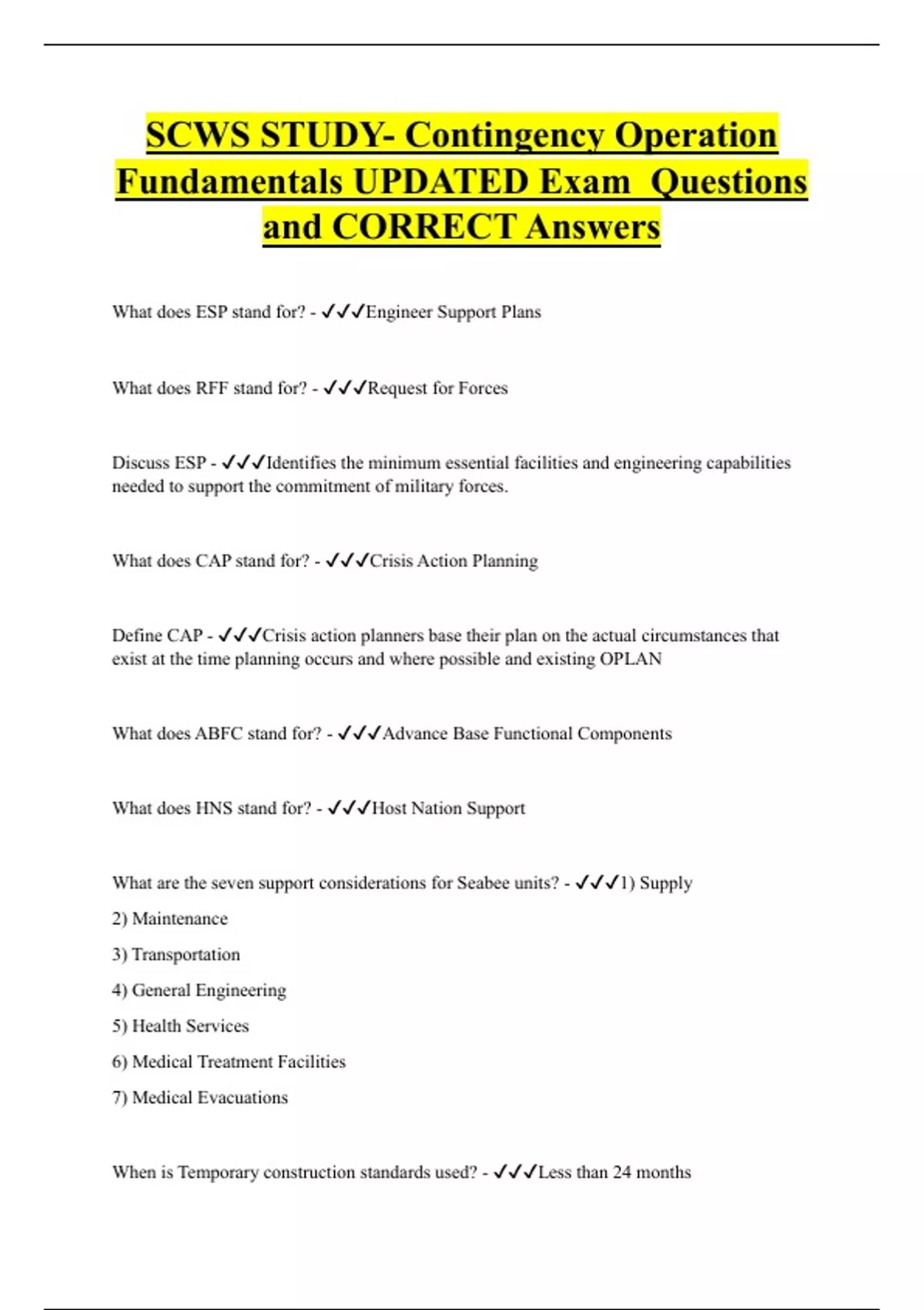 SCWS STUDY- Contingency Operation Fundamentals UPDATED Exam Questions and CORRECT Answers
