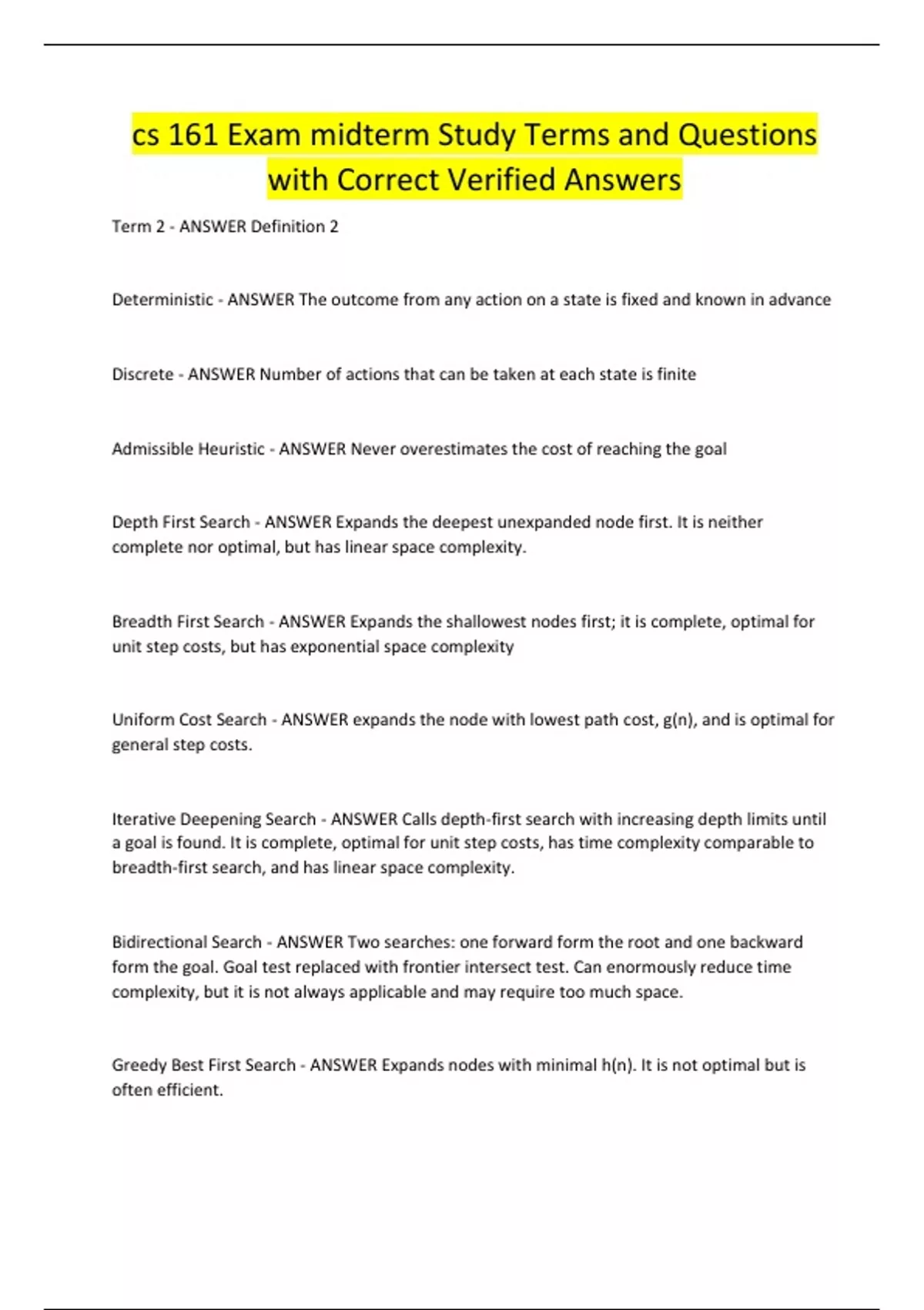 cs 161 Exam midterm Study Terms and Questions with Correct Verified Answers