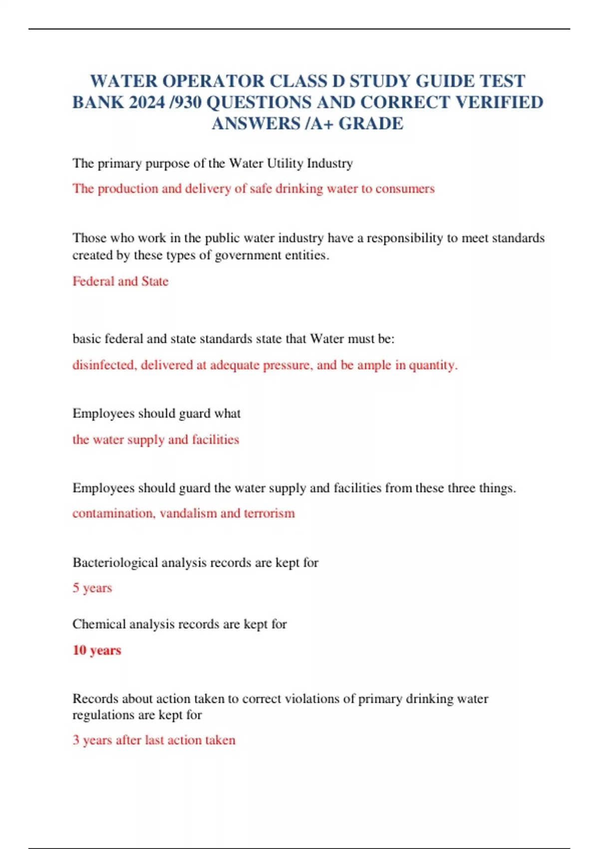 WATER OPERATOR CLASS D STUDY GUIDE TEST BANK 2024 /930 QUESTIONS AND CORRECT VERIFIED ANSWERS /A+ GRADE