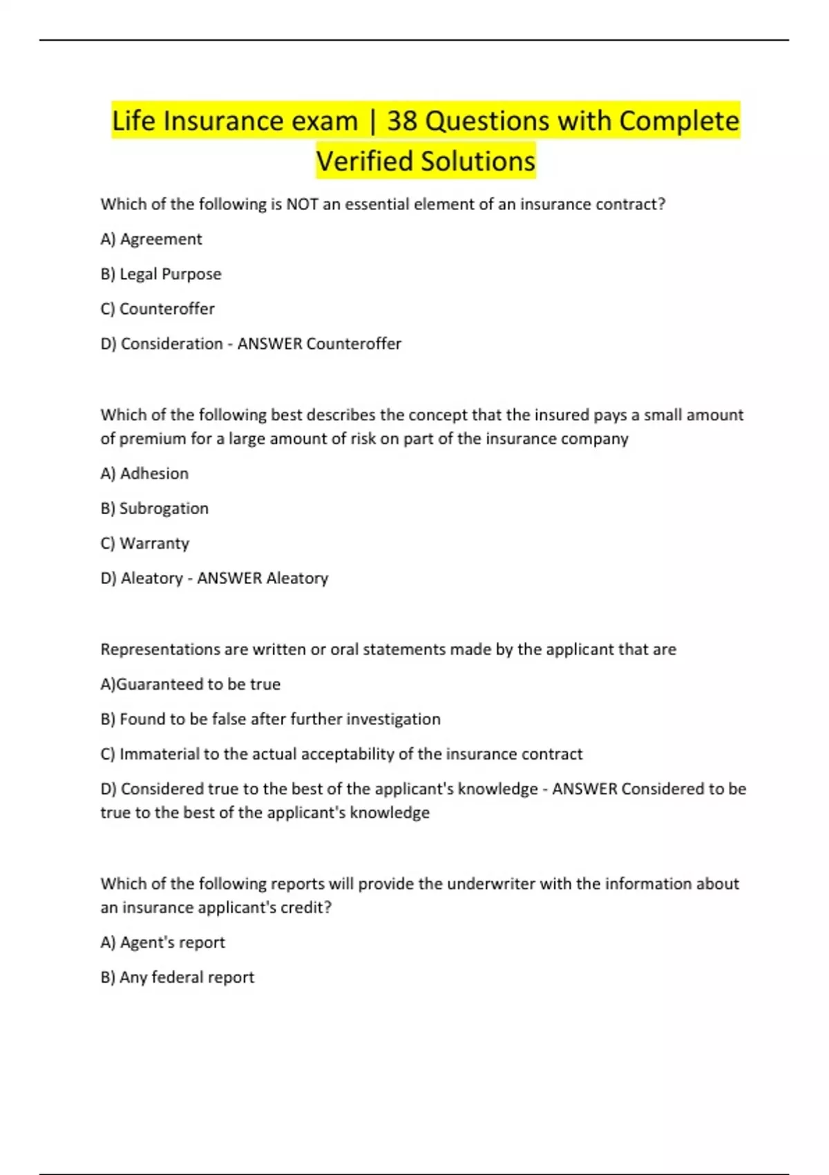Life Insurance exam | 38 Questions with Complete Verified Solutions