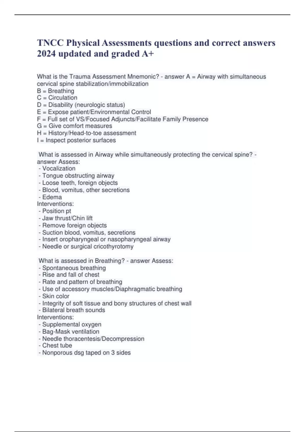 TNCC Physical Assessments questions and correct answers 2024 graded A+