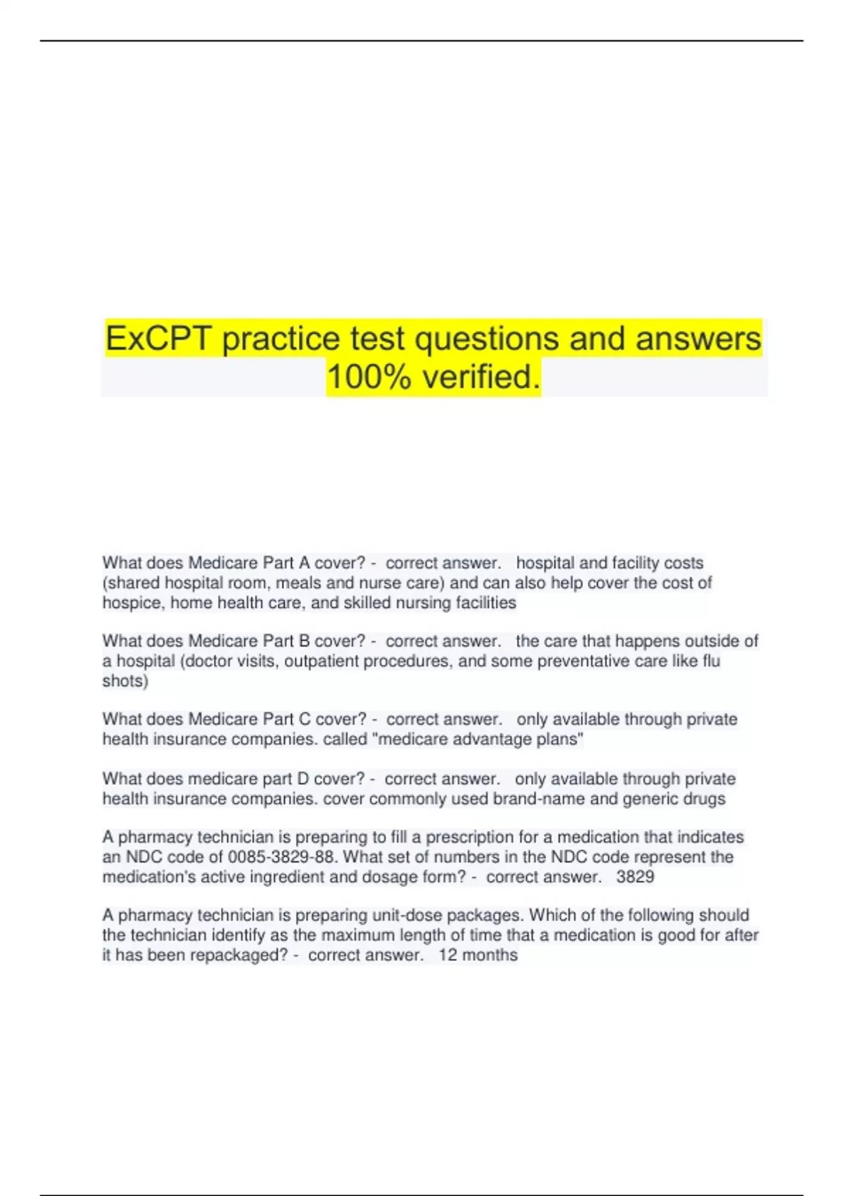 ExCPT practice test questions and answers 100% verified. What does Medicare Part A cover? - correct answer. hospital and facility costs (shared hospital room, meals and nurse care) and can also help cover the cost of hospice, home health care, and skilled nursing facilities What does Medicare Part B cover? - correct answer. the care that happens outside of a hospital (doctor visits, outpatient procedures, and some preventative care like flu shots) What does Medicare Part C cover? - correct answer. only available through private health insurance companies. called "medicare advantage plans" What does medicare part D cover? - correct answer. only available through private health insurance companies. cover commonly used brand-name and generic drugs A pharmacy technician is preparing to fill a prescription for a medication that indicates an NDC code of . What set of numbers in the NDC code represent the medication's active ingredient and dosage form? - correct answer. 3829 A pharmacy technician is preparing unit-dose packages. Which of the following should the technician identify as the maximum length of time that a medication is good for after it has been repackaged? - correct answer. 12 months A pharmacy tecnician in a hospital setting receives a bottle of a partially used medication that a patient's prescriber has discontinued. What action should the technician take? - correct answer. The technician should set aside the medication in a secure location to await disposal. According to HIPPA privacy rules, what is a requirement regarding patients' acknowledgement signatures? - correct answer. the technician should identify that acknowledgement signatures must be maintained separately from the patient consultation log. True or false, the prescriber's address is a basic element of a prescription - correct answer. true What axillary label should a pharmacy tech place on a prescription for amoxicillin suspension (Amoxil)? - correct answer. shake well before use what color ink should a prescription be written in? - correct answer. standard black ink what organization should be contacted if a pharmacy tech receives a delivery of medications that appear to be counterfeit (according to the Drug Supply Chain Security Act)? - correct answer. FDA (contact within 24 hr if a med appears to be counterfeit) a pharmacy tech realizes a chemotherapy med was administered to a pt via the wrong route of administration. What action should the tech take? - correct answer. notify the facility's medication safety committee of the error. A pharmacy tech compounded an IV solution and later noticed the formulation of a precipitate. What should the technician identify as a factor that causes this incompatibility? - correct answer. temperature What is the minimum age that the CDC recommends getting a seasonal flu vaccine? - correct answer. 6 months A pharmacy tech is preparing to compound 1 g ampicillin (principen) and does not know how much diluent to use. In what location can the tech find information about how much diluent they should use? - correct answer. Product Package Insert Two medications that are therapeutic equivalents have what feature that is the same? - correct answer. "A" rated pharmaceutical equivalents A pharm tech is scanning a bar code on a medication bottle. What information should the tech expect the bar code to include? - correct answer. dosage form, strength, and name of medication PAR represents what inventory control system? - correct answer. Periodic Automatic Replenishment-- which ensures that a consistent supply of medications are kept on hand on medical facility floors True or false, Latanoprost (Xalatan) is required to be sent in a refrigerated tote? - correct answer. true True or false, Azitromycin (Zithromax) is required to be sent in a refrigerated tote? - correct answer. false What is the set percentage of the cost of a prescription that must be paid by the patient? - correct answer. Coinsurance A pharmacy tech receives a prescription with the quantity indicated as "Disp. LX." What dosage units should the technician count out? - correct answer. 60 A pharmacy tech is assisting an older adult pt who states he has trouble remembering to take his medication. What action should the technician take? - correct answer. suggest the patient use a daily medication container. What is a method used to minimize incompatibilities of compounded solutions? - correct answer. limit the number or drugs added to solutions What controlled substance schedule includes anabolic steroids? - correct answer. III What controlled substance schedule is Heroin in? - correct answer. I What controlled substance schedule is Marijuana in? - correct answer. I What controlled substance schedule is Oxymorphone (open) in? - correct answer. II What controlled substance schedule is Morphine in? - correct answer. II What controlled substance schedule is secobarbital in? - correct answer. II What controlled substance schedule is methylphenidate (Ritalin) in? - correct answer. II What controlled substance schedule is buprenorphine in? - correct answer. III What controlled substance schedule is barbituric acid and its derivitates in? - correct answer. III What controlled substance schedule is alprazolam (Xanax) in? - correct answer. IV What controlled substance schedule is phenobarbital in? - correct answer. IV