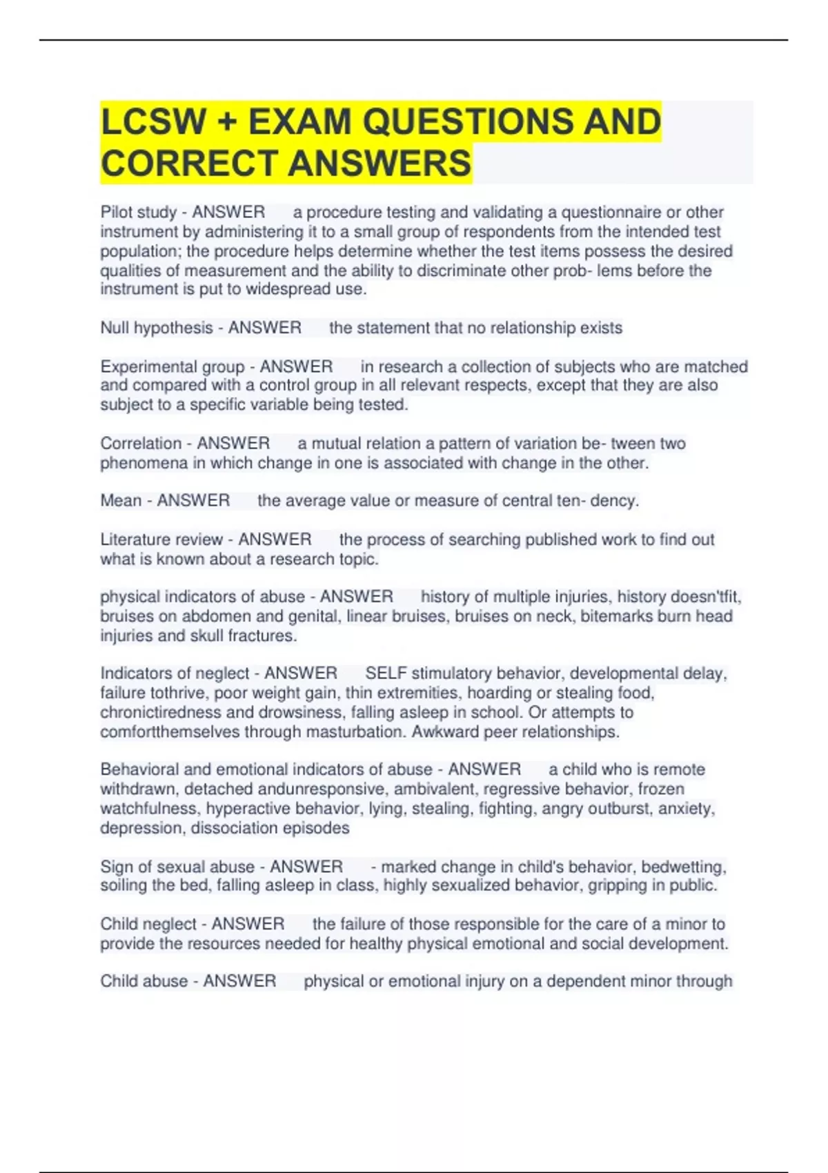 LCSW + EXAM QUESTIONS AND CORRECT ANSWERS Pilot study - ANSWER a procedure testing and validating a questionnaire or other instrument by administering it to a small group of respondents from the intended test population; the procedure helps determine whether the test items possess the desired qualities of measurement and the ability to discriminate other prob- lems before the instrument is put to widespread use. Null hypothesis - ANSWER the statement that no relationship exists Experimental group - ANSWER in research a collection of subjects who are matched and compared with a control group in all relevant respects, except that they are also subject to a specific variable being tested. Correlation - ANSWER a mutual relation a pattern of variation be- tween two phenomena in which change in one is associated with change in the other. Mean - ANSWER the average value or measure of central ten- dency. Literature review - ANSWER the process of searching published work to find out what is known about a research topic. physical indicators of abuse - ANSWER history of multiple injuries, history doesn'tfit, bruises on abdomen and genital, linear bruises, bruises on neck, bitemarks burn head injuries and skull fractures. Indicators of neglect - ANSWER SELF stimulatory behavior, developmental delay, failure tothrive, poor weight gain, thin extremities, hoarding or stealing food, chronictiredness and drowsiness, falling asleep in school. Or attempts to comfortthemselves through masturbation. Awkward peer relationships. Behavioral and emotional indicators of abuse - ANSWER a child who is remote withdrawn, detached andunresponsive, ambivalent, regressive behavior, frozen watchfulness, hyperactive behavior, lying, stealing, fighting, angry outburst, anxiety, depression, dissociation episodes