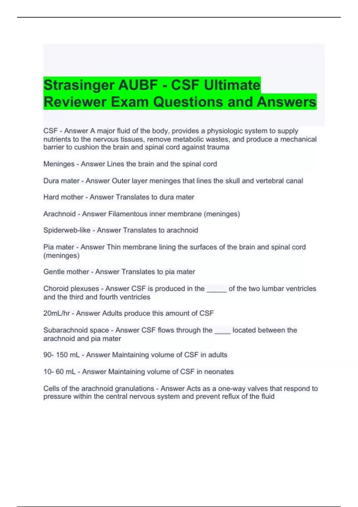 Strasinger AUBF - CSF Ultimate Reviewer Exam Questions and Answers