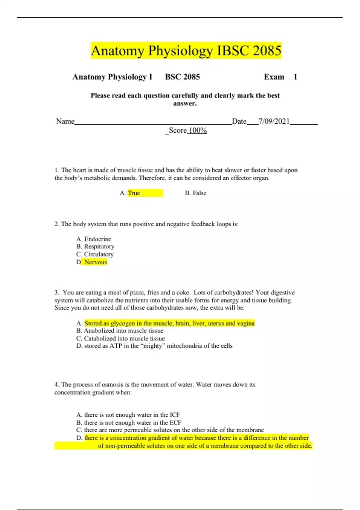 Anatomy Physiology I BSC 2085 Anatomy Physiology I BSC 2085 Exam 1 Please read each question carefully and clearly mark the best answer. Name Date 7/09/2021 _Score 100% 1. The heart is made of muscle tissue and has the ability to beat slower or faster based upon the body’s metabolic demands. Therefore, it can be considered an effector organ. A. True B. False 2. The body system that runs positive and negative feedback loops is: A. Endocrine B. Respiratory C. Circulatory D. Nervous 3. You are eating a meal of pizza, fries and a coke. Lots of carbohydrates! Your digestive system will catabolize the nutrients into their usable forms for energy and tissue building. Since you do not need all of those carbohydrates now, the extra will be: A. Stored as glycogen in the muscle, brain, liver, uterus and vagina B. Anabolized into muscle tissue C. Catabolized into muscle tissue D. stored as ATP in the “mighty” mitochondria of the cells 4. The process of osmosis is the movement of water. Water moves down its concentration gradient when: A. there is not enough water in the ICF B. there is not enough water in the ECF C. there are more permeable solutes on the other side of the membrane D. there is a concentration gradient of water because there is a difference in the number of non-permeable solutes on one side of a membrane compared to the other side. 5. Solutes driven by the process of osmosis could cause a cell to swell or crenate. A. True B. False 6. Amino acid are linked together to form peptides and proteins for use in the body. This process occurs as a result of: A. random selection B. negative feedback loops C. both of the above 7. Free radicals are defined as a short-lived particle that have an unusual number of electrons. The presence of free radicals in human tissue can cause premature aging, cancer and death because: A. they destroy phospholipids B. they damage organs C. they damage macromolecules like proteins and DNA D. they kill cells 8. Eating a healthy diet that contains a lot of antioxidants is helpful in neutralizing free radicals. This substance is made in most cells and also helps neutralize free radicals. A. super oxide dismutase B. electrolytes C. cations D. isomers 9. A patient with an ingrown toe nail would be described as having a problem with this area of the foot: A. ventral B. proximal C. dorsal D. ipsilateral 10. These substances are necessary to make sure our body fluids are highly conductive for electricity A. minerals B. vitamins C. electrolytes D. isotopes 11. This plane divides the body into right and left halves. A. coronal B. frontal C. transverse D. mid-sagittal 12. Using the numbers 1-6, place the terms in order from small to Large. _2 molecule 1_ atom _.4 cell 3_ organelle 5_ tissue _6 organ 13. Which of the following are monosaccharides (please circle three): A. galactose B. maltose C. fructose D. cellulose E. glycogen F. glucose 14. These molecules are the most efficient form of energy storage because they contain more calories per gram than other forms of energy: A. starch B. ATP C. cellulose
