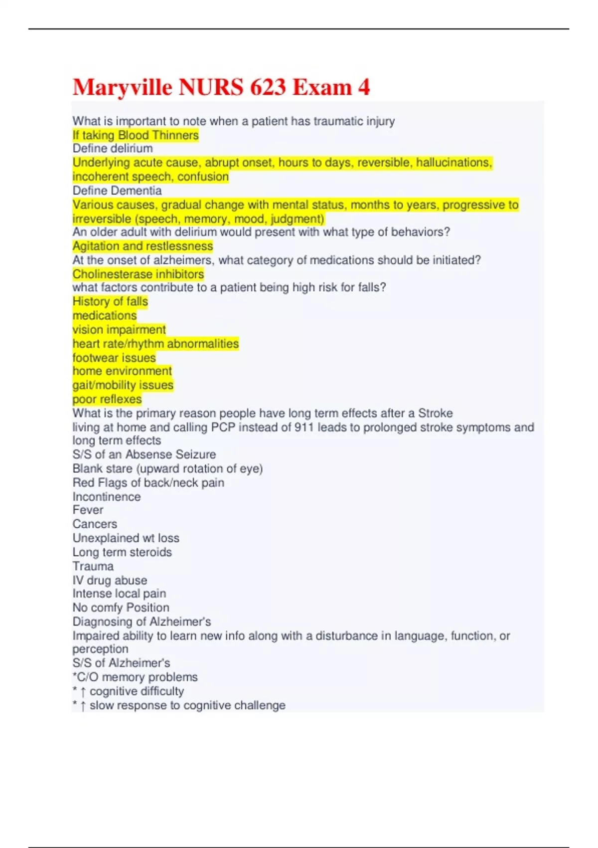 Maryville NURS 623 Exam 4 What is important to note when a patient has traumatic injury If taking Blood Thinners Define delirium Underlying acute cause, abrupt onset, hours to days, reversible, hallucinations, incoherent speech, confusion Define Dementia Various causes, gradual change with mental status, months to years, progressive to irreversible (speech, memory, mood, judgment) An older adult with delirium would present with what type of behaviors? Agitation and restlessness At the onset of alzheimers, what category of medications should be initiated? Cholinesterase inhibitors what factors contribute to a patient being high risk for falls? History of falls medications vision impairment heart rate/rhythm abnormalities footwear issues home environment gait/mobility issues poor reflexes What is the primary reason people have long term effects after a Stroke living at home and calling PCP instead of 911 leads to prolonged stroke symptoms and long term effects S/S of an Absense Seizure Blank stare (upward rotation of eye) Red Flags of back/neck pain Incontinence Fever Cancers Unexplained wt loss Long term steroids Trauma IV drug abuse Intense local pain No comfy Position Diagnosing of Alzheimer's Impaired ability to learn new info along with a disturbance in language, function, or perception S/S of Alzheimer's *C/O memory problems * ↑ cognitive difficulty * ↑ slow response to cognitive challeng