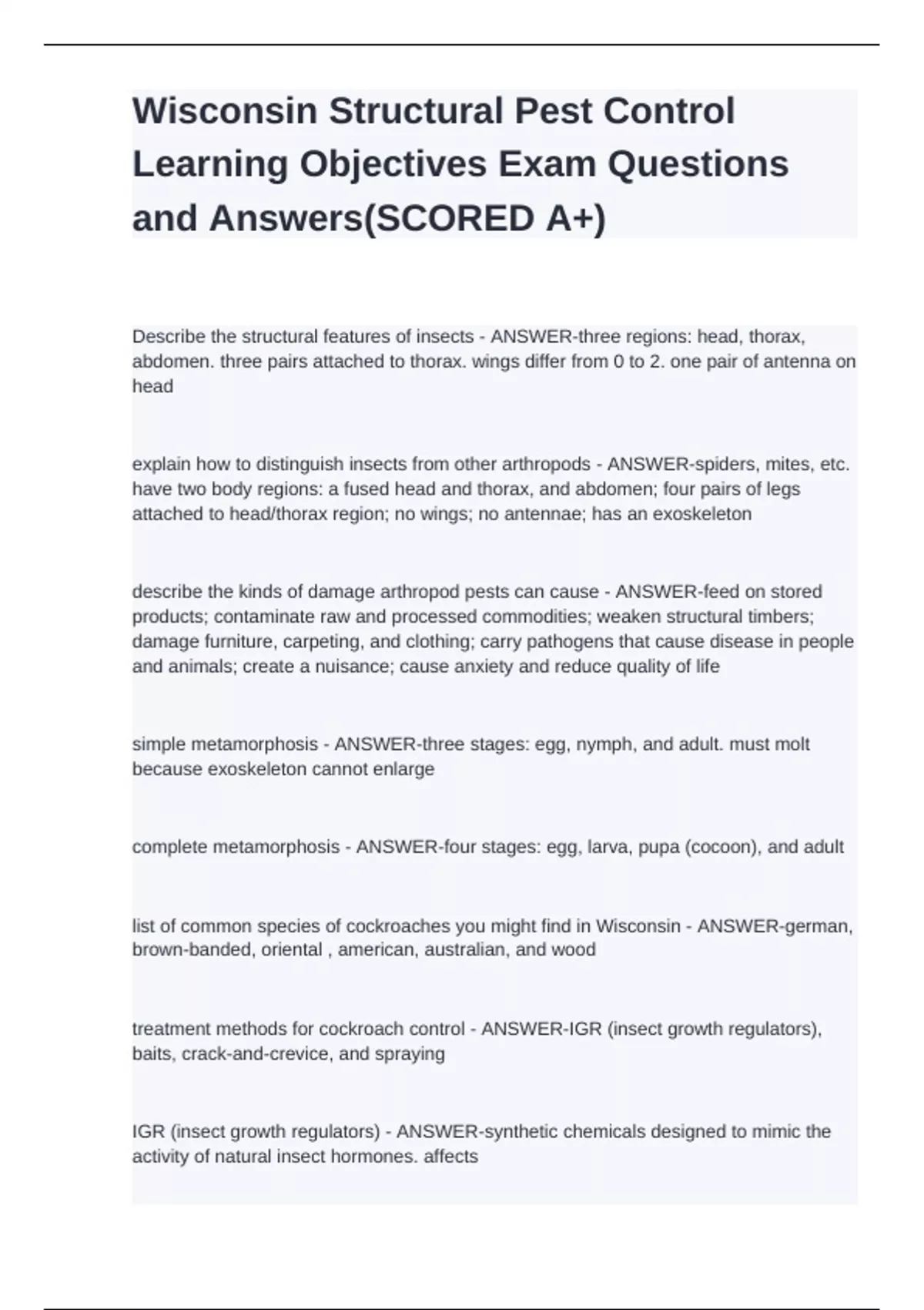 Wisconsin Structural Pest Control Learning Objectives Exam Questions and Answers(SCORED A+)