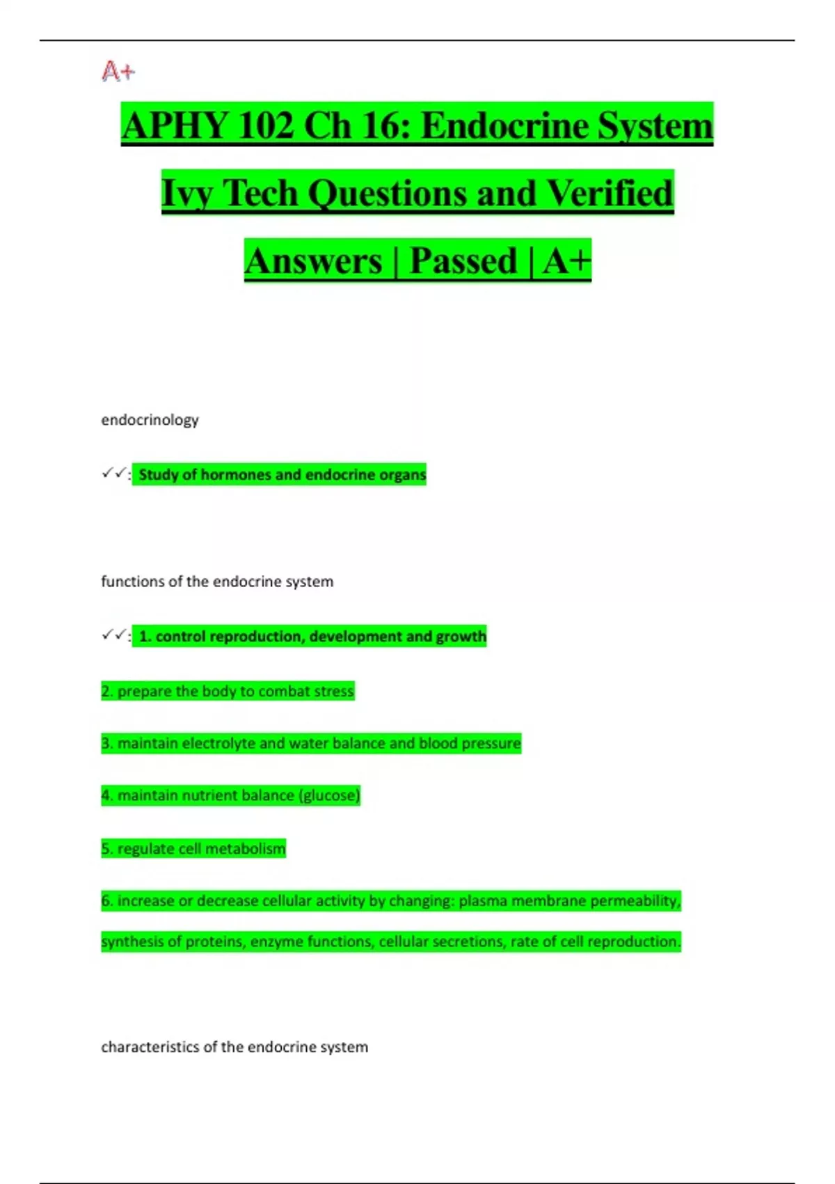 APHY 102 Ch 16: Endocrine System Ivy Tech Questions and Verified Answers | Passed | A+