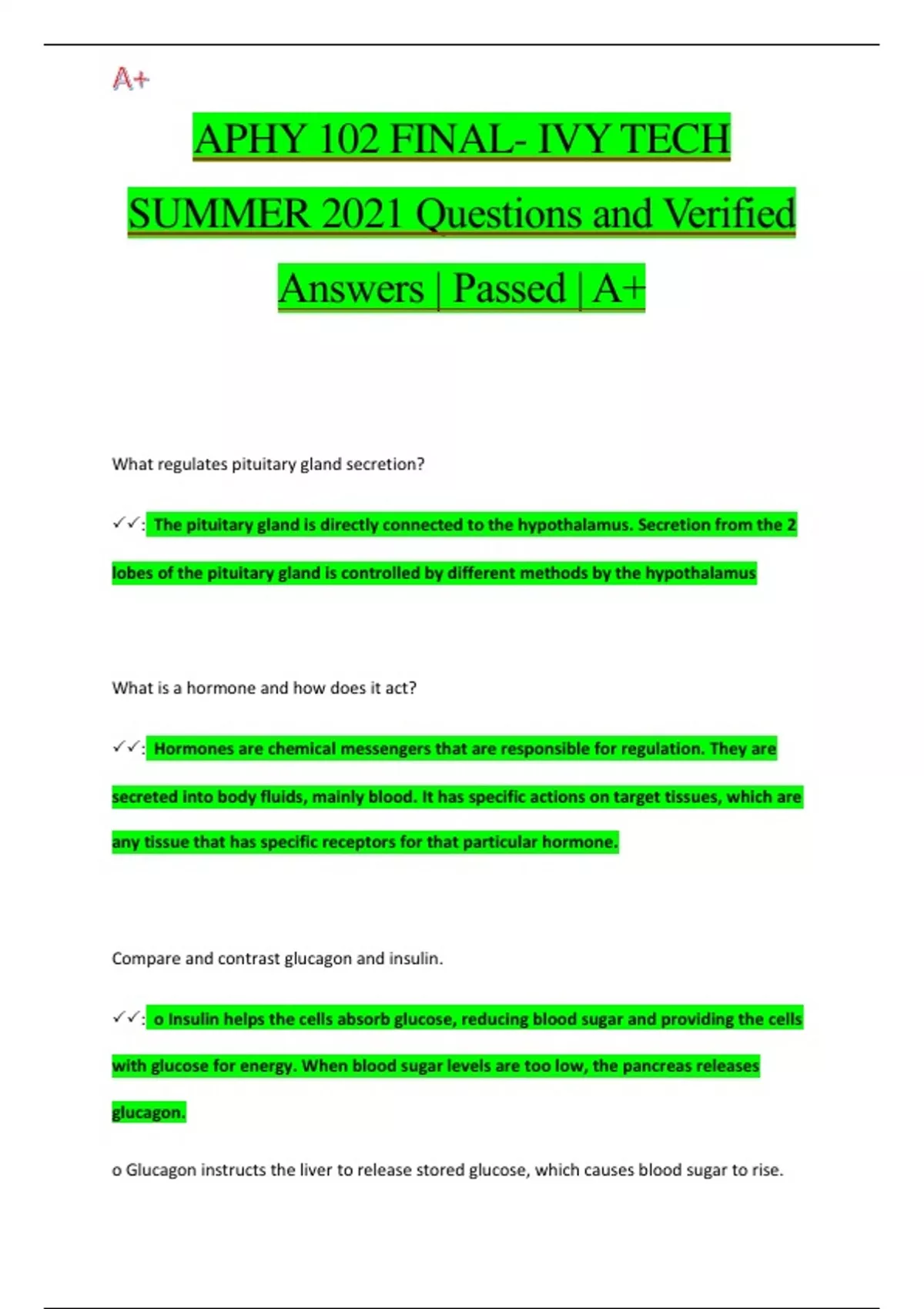 APHY 102 FINAL- IVY TECH SUMMER 2021 Questions and Verified Answers | Passed | A+