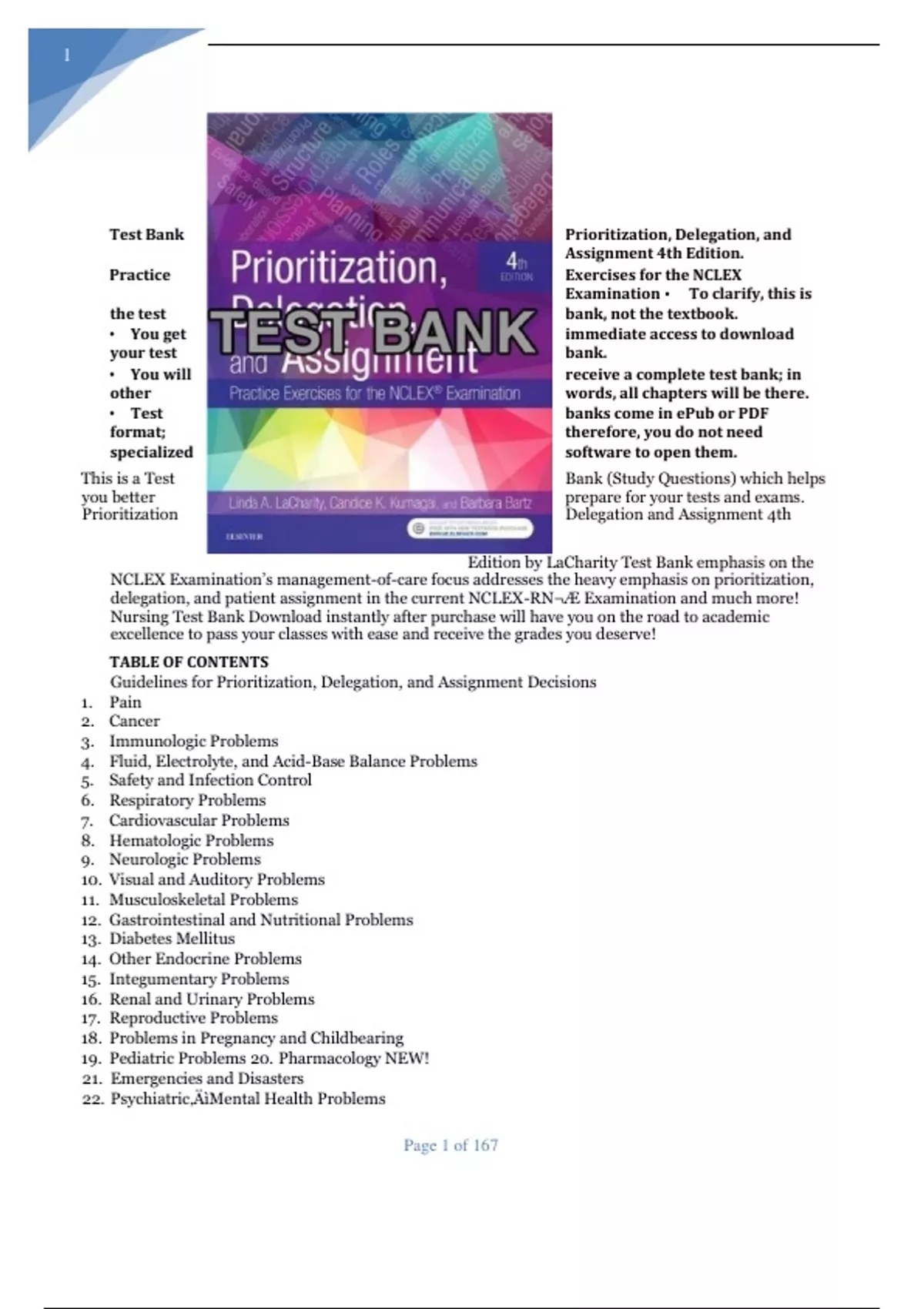 Test Bank Prioritization, Delegation, and Assignment 4th Edition Exercises for the NCLEX Examination. Test Bank Prioritization, Delegation, and Assignment 4th Edition Exercises for the NCLEX Examination.