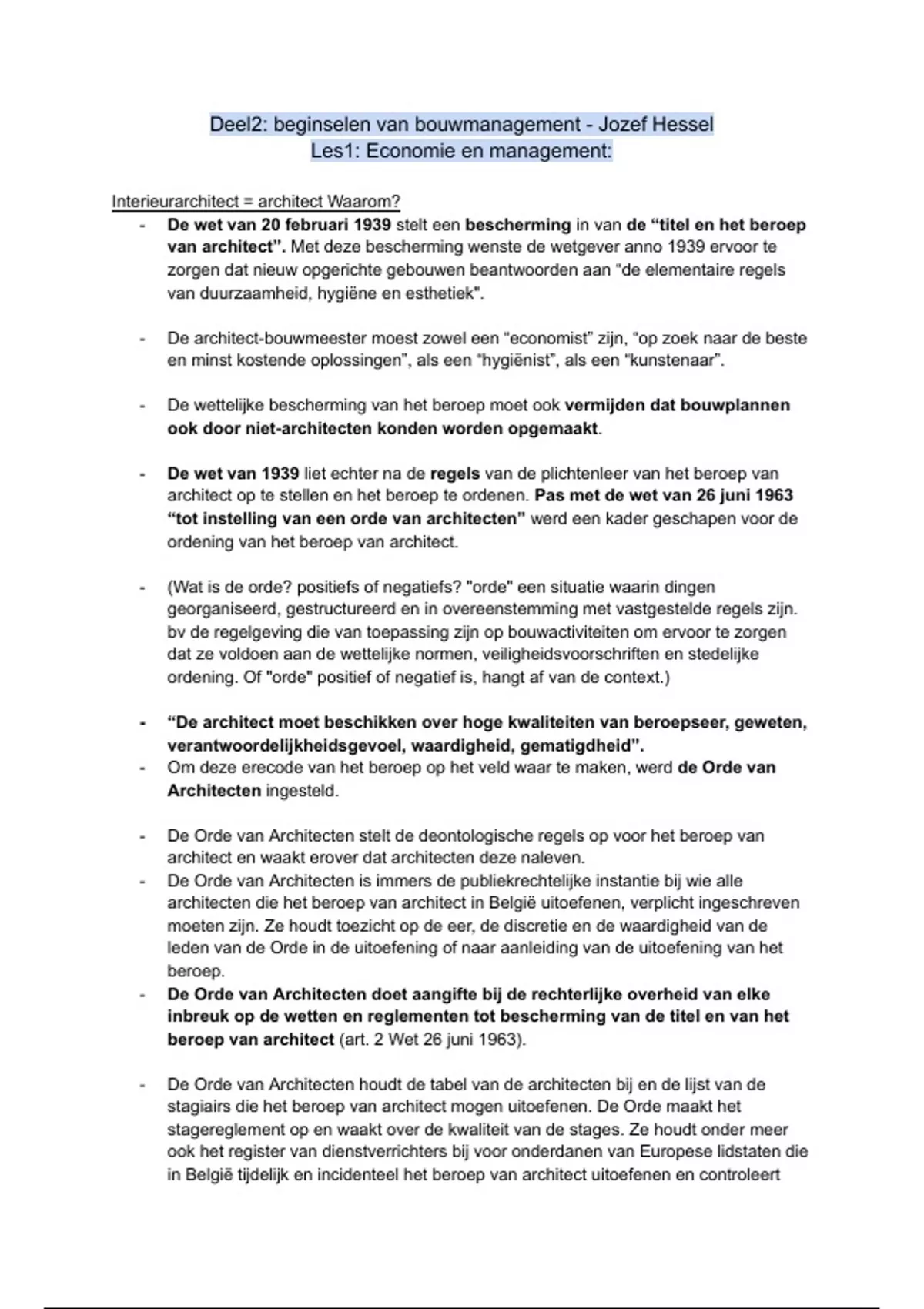 De lesreeks gaat ENKEL over de beginselen en bouwmanagement, gegeven door professor Jozef Hessel. Hij heeft drie uitgebreide lessen verzorgd, waarvan de inhoud in dit document is samengevat. Naast de samenvattingen van de lessen, zijn ook de examenvragen opgenomen die professor Hessel heeft genoemd. Het document bevat ook examenvragen en het examenzelf bevat een giscorrectie,