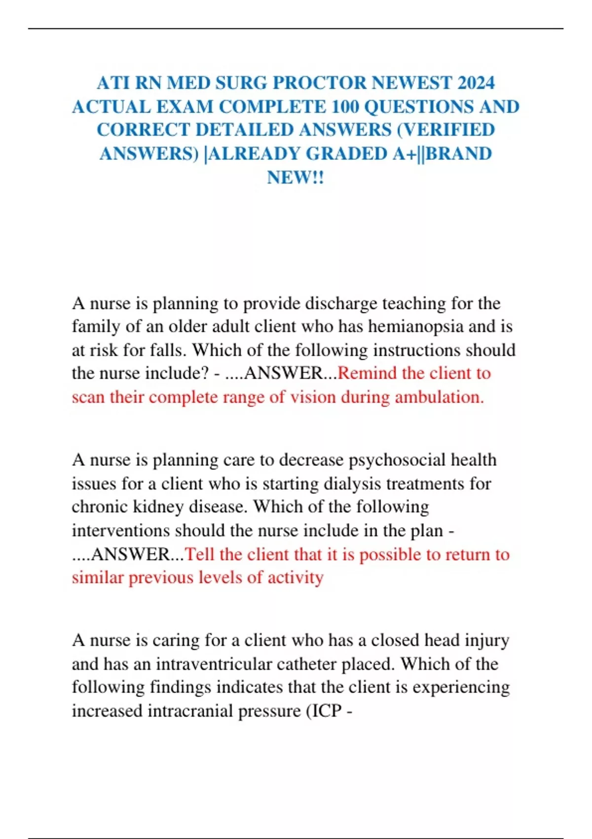 ATI RN MED SURG PROCTOR NEWEST 2024 ACTUAL EXAM COMPLETE 100 QUESTIONS AND CORRECT DETAILED ANSWERS (VERIFIED ANSWERS) |ALREADY GRADED A+||BRAND NEW!!