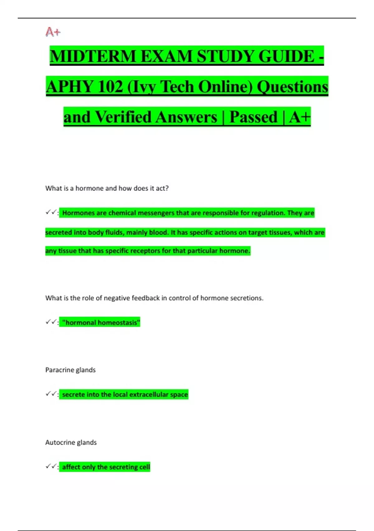 MIDTERM EXAM STUDY GUIDE - APHY 102 (Ivy Tech Online) Questions and Verified Answers | Passed | A+
