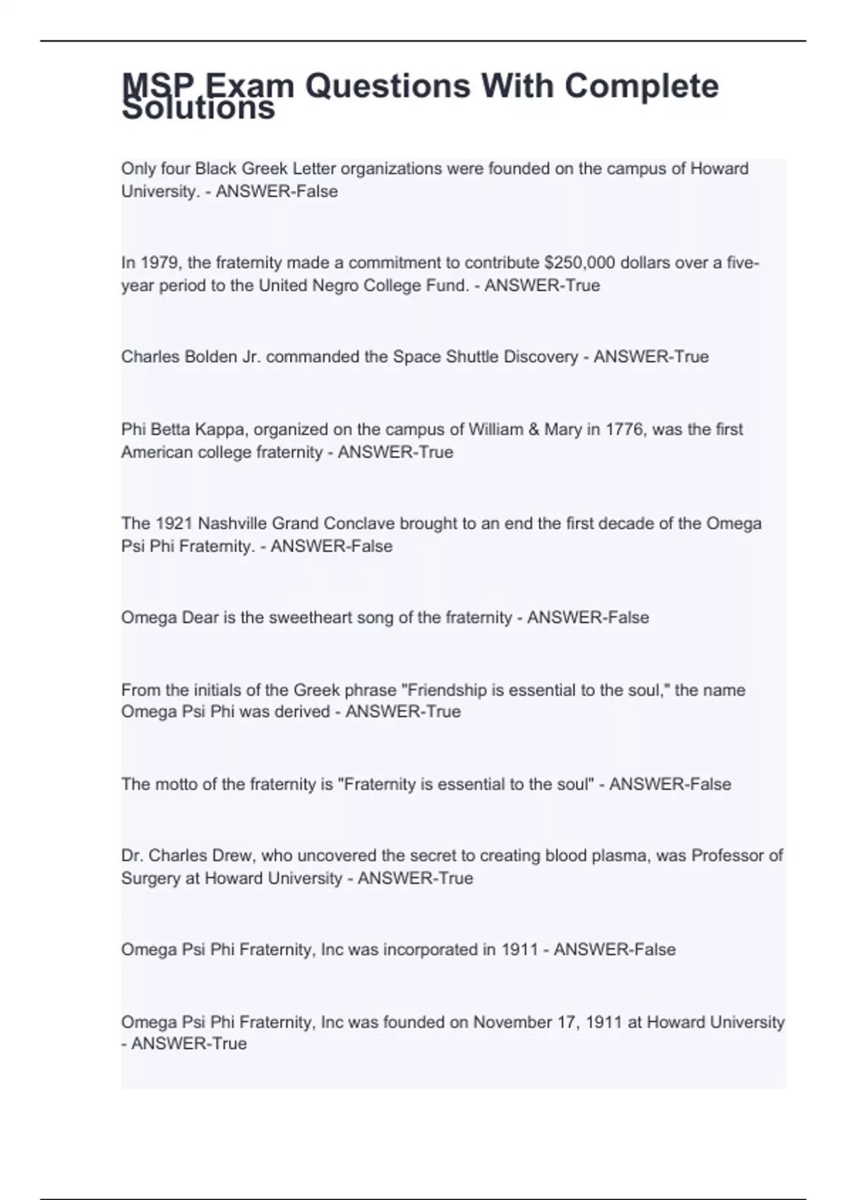 Only four Black Greek Letter organizations were founded on the campus of Howard University. - ANSWER-False In 1979, the fraternity made a commitment to contribute $250,000 dollars over a five-year period to the United Negro College Fund. - ANSWER-True Charles Bolden Jr. commanded the Space Shuttle Discovery - ANSWER-True Phi Betta Kappa, organized on the campus of William & Mary in 1776, was the first American college fraternity - ANSWER-True The 1921 Nashville Grand Conclave brought to an end the first decade of the Omega Psi Phi Fraternity. - ANSWER-False Omega Dear is the sweetheart song of the fraternity - ANSWER-False From the initials of the Greek phrase "Friendship is essential to the soul," the name Omega Psi Phi was derived - ANSWER-True The motto of the fraternity is "Fraternity is essential to the soul" - ANSWER-False Dr. Charles Drew, who uncovered the secret to creating blood plasma, was Professor of Surgery at Howard University - ANSWER-True Omega Psi Phi Fraternity, Inc was incorporated in 1911 - ANSWER-False Omega Psi Phi Fraternity, Inc was founded on November 17, 1911 at Howard University - ANSWER-True