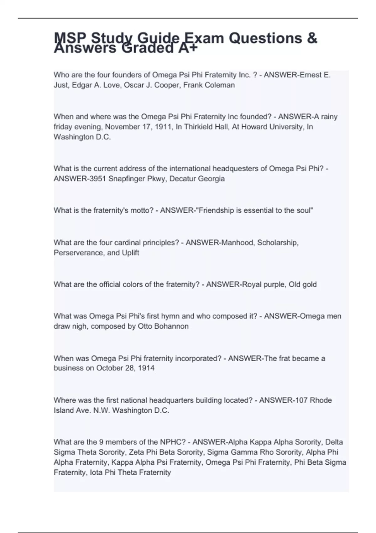 What are the 9 members of the NPHC? - ANSWER-Alpha Kappa Alpha Sorority, Delta Sigma Theta Sorority, Zeta Phi Beta Sorority, Sigma Gamma Rho Sorority, Alpha Phi Alpha Fraternity, Kappa Alpha Psi Fraternity, Omega Psi Phi Fraternity, Phi Beta Sigma Fraternity, Iota Phi Theta Fraternity When and where was Omega Psi Phi Fraternity's first faculty chair endowed? - ANSWER-1981, Holly Springs Mississippi