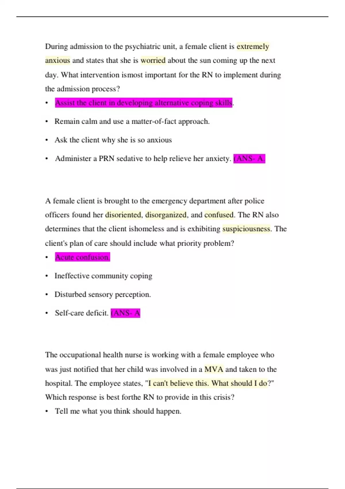 During admission to the psychiatric unit, a female client is extremely anxious and states that she is worried about the sun coming up the next day. What intervention ismost important for the RN to implement during the admission process? • Assist the client in developing alternative coping skills. • Remain calm and use a matter-of-fact approach. • Ask the client why she is so anxious • Administer a PRN sedative to help relieve her anxiety. (ANS- A. A female client is brought to the emergency department after police officers found her disoriented, disorganized, and confused. The RN also determines that the client ishomeless and is exhibiting suspiciousness. The client's plan of care should include what priority problem? • Acute confusion. • Ineffective community coping • Disturbed sensory perception. • Self-care deficit. (ANS- A The occupational health nurse is working with a female employee who was just notified that her child was involved in a MVA and taken to the hospital. The employee states, "I can't believe this. What should I do?" Which response is best forthe RN to provide in this crisis? • Tell me what you think should happen. • How serious was the collision? • What do you think you should do? • Call for transportation to the hospital. (ANS- D A client tells the RN that he has an IQ of 400+ and is a genius and an inventor. Healso reports that he is married to a female movie star and thinks that his brother wants a sexual relationship with her. What is the priority nursing problem for admission to the psychiatric unit? • Ineffective sexual patterns. • Impaired environmental interpretation. • Disturbed sensory perception. • Compromised family coping. (ANS- A The RN is providing care for a client diagnosed with borderline personality disorder who has self-inflicted lacerations on the abdomen. Which approach should the RN use when changing this client's dressing? A. Provide detailed thorough explanations when cleansing wound.B. Perform the dressing change in a non-judgmental manner. C. Ask in a non-threatening manner why the client cut own abdomen. D. Request another staff member assist with the dressing change. (ANS- B While sitting in the day room of the mental health unit, a male adolescent avoids eyecontact, looks at the floor, and talks softly when interacting verbally with the RN. The two trade places, and the RN demonstrates the client's behaviors. What is the main goal of this therapeutic technique? • Initiate a non-threatening conversation with the client. • Dialog about the ineffectiveness of his interactions.C. Allow the client to identify the way he interacts. D. Discuss the client's feelings when he responds. (ANS- C An antidepressant medication is prescribed for a client who reports sleeping only 4 hours in the past 2 days and weight loss of 9 lbs within the last month. Which clientgoal is most important to achieve within the first three days of treatment? A. Meet scheduled appointment with dietitian.B. Sleep at least 6 hours a night. C. Understands the purpose of the medication regimen. D. Describes the reasons for hospitalization. (ANS- B When preparing to administer to domestic violence screening tool to a female client,which statement should the RN provide? • If your partner is abusing you, I need to ask these questions. • State law mandates that I ask if you are a victim of domestic violence. • The HCP provider needs to know if you are experiencing any domestic abuse. D. All clients are screened for domestic abuse because it is common in our society.(ANS- D A young adult female visits the mental health clinic complaining of diarrhea, headache, and muscle aches. She is afebrile, denies chills, and all laboratory findings are within normal limits. During the physical assessment, the client tells the RN that her sister thinks she is neurotic and calls her a hypochondriac. Which response is best for the RN to provide? • Unless your sister has a medical education, ignore her comments. • I can hear that your sister comments are over-whelming you. • Do you think it's possible that you might be a hypochondriac? • Besides your sister's comments, what in your life is troubling you? (ANS- D