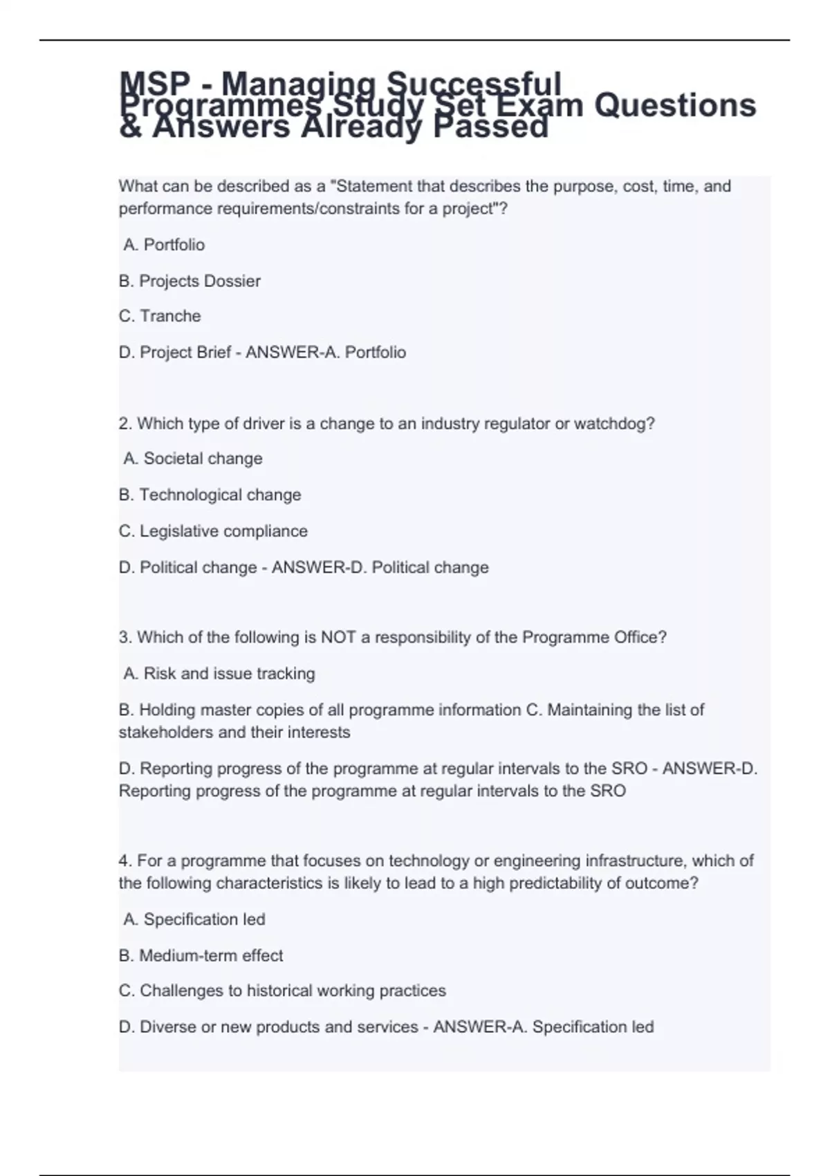 4. For a programme that focuses on technology or engineering infrastructure, which of the following characteristics is likely to lead to a high predictability of outcome? A. Specification led B. Medium-term effect C. Challenges to historical working practices D. Diverse or new products and services - ANSWER-A. Specification led 5. For a programme that focuses on business transformation, which of the following characteristics is likely to lead to a low predictability of outcome? A. Specification led B. Medium-term effect C. Adoption of best practice D. Volatility of the marketplace - ANSWER-D. Volatility of the marketplace