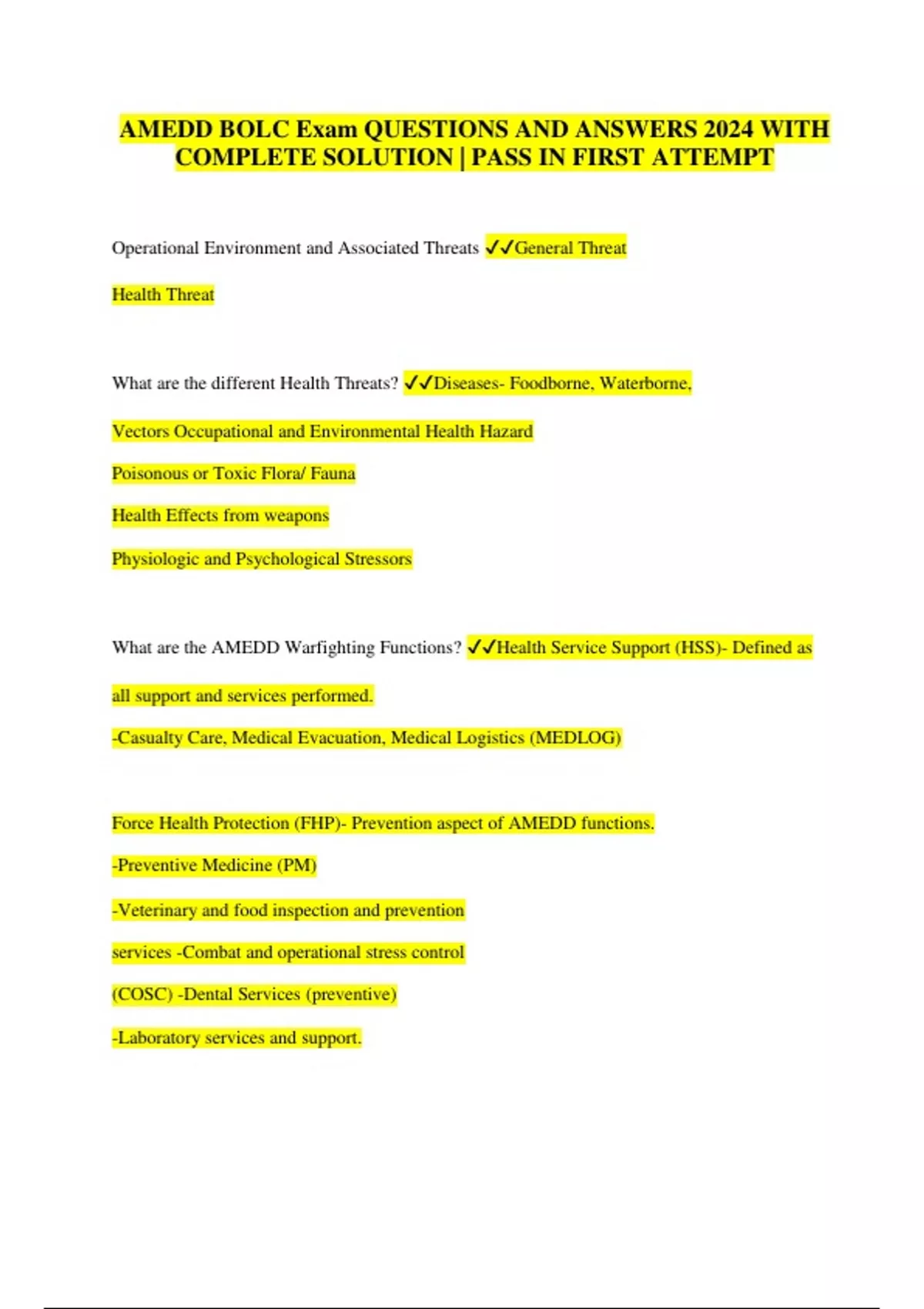 AMEDD BOLC Exam QUESTIONS AND ANSWERS 2024 WITH COMPLETE SOLUTION | PASS IN FIRST ATTEMPT Operational Environment and Associated Threats General Threat Health Threat What are the different Health Threats? Diseases- Foodborne, Waterborne, Vectors Occupational and Environmental Health Hazard Poisonous or Toxic Flora/ Fauna Health Effects from weapons Physiologic and Psychological Stressors What are the AMEDD Warfighting Functions? Health Service Support (HSS)- Defined as all support and services performed. -Casualty Care, Medical Evacuation, Medical Logistics (MEDLOG) Force Health Protection (FHP)- Prevention aspect of AMEDD functions. -Preventive Medicine (PM) -Veterinary and food inspection and prevention services -Combat and operational stress control (COSC) -Dental Services (preventive) -Laboratory services and support.