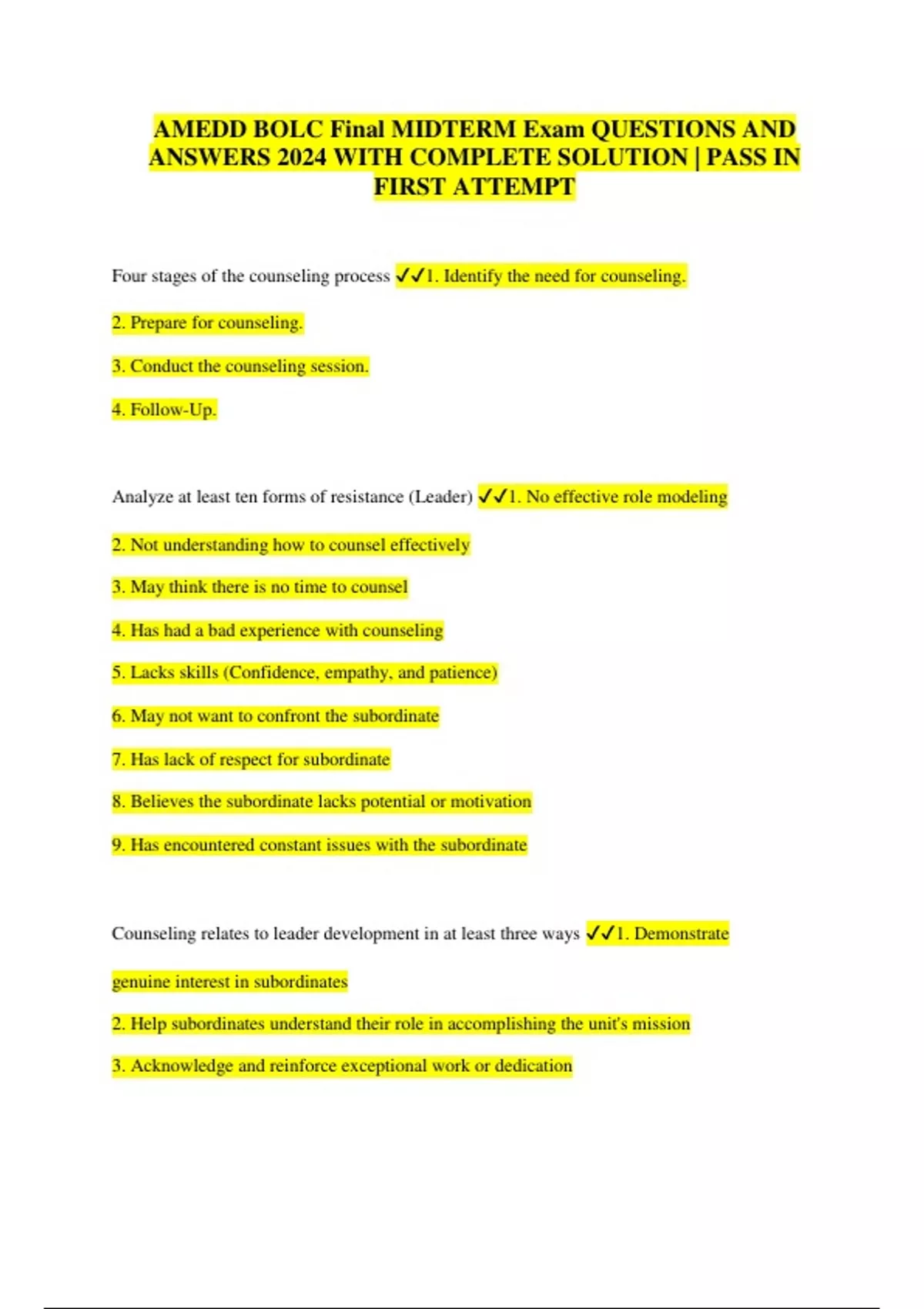 AMEDD BOLC Final MIDTERM Exam QUESTIONS AND ANSWERS 2024 WITH COMPLETE SOLUTION | PASS IN FIRST ATTEMPT Four stages of the counseling process 1. Identify the need for counseling. 2. Prepare for counseling. 3. Conduct the counseling session. 4. Follow-Up. Analyze at least ten forms of resistance (Leader) 1. No effective role modeling 2. Not understanding how to counsel effectively 3. May think there is no time to counsel 4. Has had a bad experience with counseling 5. Lacks skills (Confidence, empathy, and patience) 6. May not want to confront the subordinate 7. Has lack of respect for subordinate 8. Believes the subordinate lacks potential or motivation 9. Has encountered constant issues with the subordinate Counseling relates to leader development in at least three ways 1. Demonstrate genuine interest in subordinates 2. Help subordinates understand their role in accomplishing the unit's mission 3. Acknowledge and reinforce exceptional work or dedication