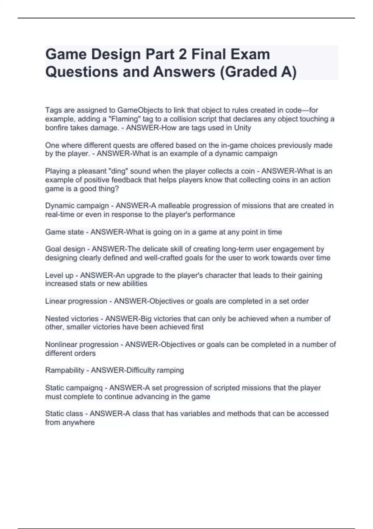 Game Design Part 2 Final Exam Questions and Answers (Graded A)Game Design Part 2 Final Exam Questions and Answers (Graded A)Game Design Part 2 Final Exam Questions and Answers (Graded A)Game Design Part 2 Final Exam Questions and Answers (Graded A)Game Design Part 2 Final Exam Questions and Answers (Graded A) Tags are assigned to GameObjects to link that object to rules created in code—for example, adding a "Flaming" tag to a collision script that declares any object touching a bonfire takes damage. - ANSWER-How are tags used in Unity One where different quests are offered based on the in-game choices previously made by the player. - ANSWER-What is an example of a dynamic campaign Playing a pleasant "ding" sound when the player collects a coin - ANSWER-What is an