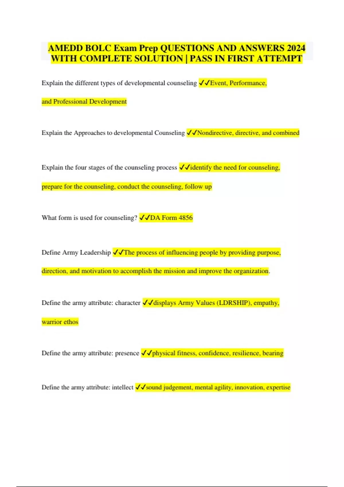 AMEDD BOLC Exam Prep QUESTIONS AND ANSWERS 2024 WITH COMPLETE SOLUTION | PASS IN FIRST ATTEMPT Explain the different types of developmental counseling Event, Performance, and Professional Development Explain the Approaches to developmental Counseling Nondirective, directive, and combined Explain the four stages of the counseling process identify the need for counseling, prepare for the counseling, conduct the counseling, follow up What form is used for counseling? DA Form 4856 Define Army Leadership The process of influencing people by providing purpose, direction, and motivation to accomplish the mission and improve the organization. Define the army attribute: character displays Army Values (LDRSHIP), empathy, warrior ethos Define the army attribute: presence physical fitness, confidence, resilience, bearing Define the army attribute: intellect sound judgement, mental agility, innovation, expertise