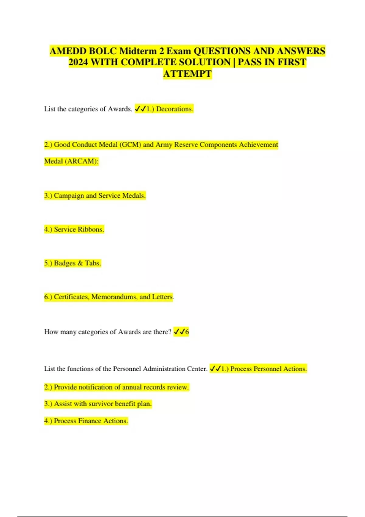 AMEDD BOLC Midterm 2 Exam QUESTIONS AND ANSWERS 2024 WITH COMPLETE SOLUTION | PASS IN FIRST ATTEMPT List the categories of Awards. 1.) Decorations. 2.) Good Conduct Medal (GCM) and Army Reserve Components Achievement Medal (ARCAM): 3.) Campaign and Service Medals. 4.) Service Ribbons. 5.) Badges & Tabs. 6.) Certificates, Memorandums, and Letters. How many categories of Awards are there? 6 List the functions of the Personnel Administration Center. 1.) Process Personnel Actions. 2.) Provide notification of annual records review. 3.) Assist with survivor benefit plan. 4.) Process Finance Actions.