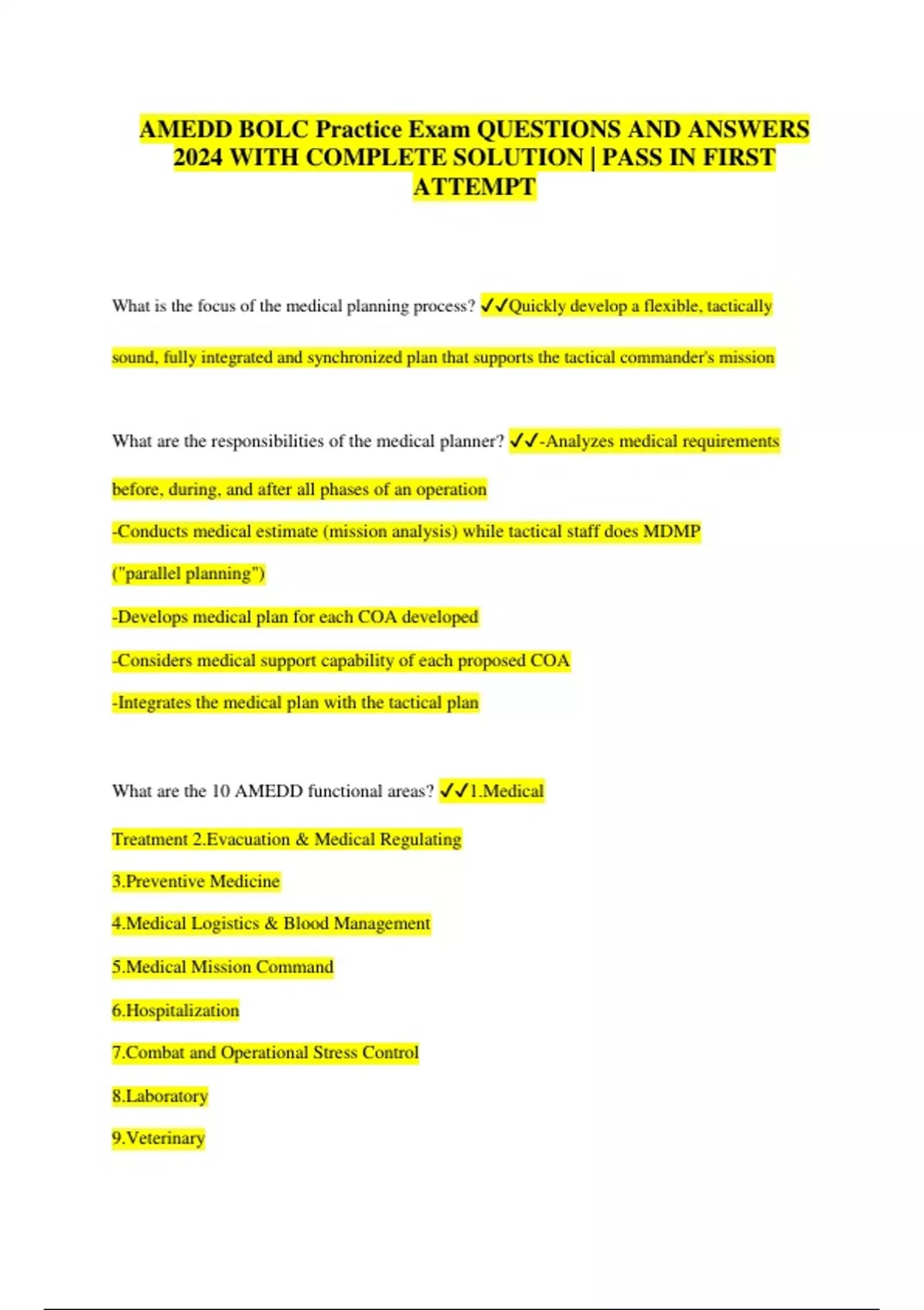 AMEDD BOLC Practice Exam QUESTIONS AND ANSWERS 2024 WITH COMPLETE SOLUTION | PASS IN FIRST ATTEMPT What is the focus of the medical planning process? Quickly develop a flexible, tactically sound, fully integrated and synchronized plan that supports the tactical commander's mission What are the responsibilities of the medical planner? -Analyzes medical requirements before, during, and after all phases of an operation -Conducts medical estimate (mission analysis) while tactical staff does MDMP ("parallel planning") -Develops medical plan for each COA developed -Considers medical support capability of each proposed COA -Integrates the medical plan with the tactical plan What are the 10 AMEDD functional areas? 1.Medical Treatment 2.Evacuation & Medical Regulating 3.Preventive Medicine 4.Medical Logistics & Blood Management 5.Medical Mission Command 6.Hospitalization 7.Combat and Operational Stress Control 8.Laboratory 9.Veterinary