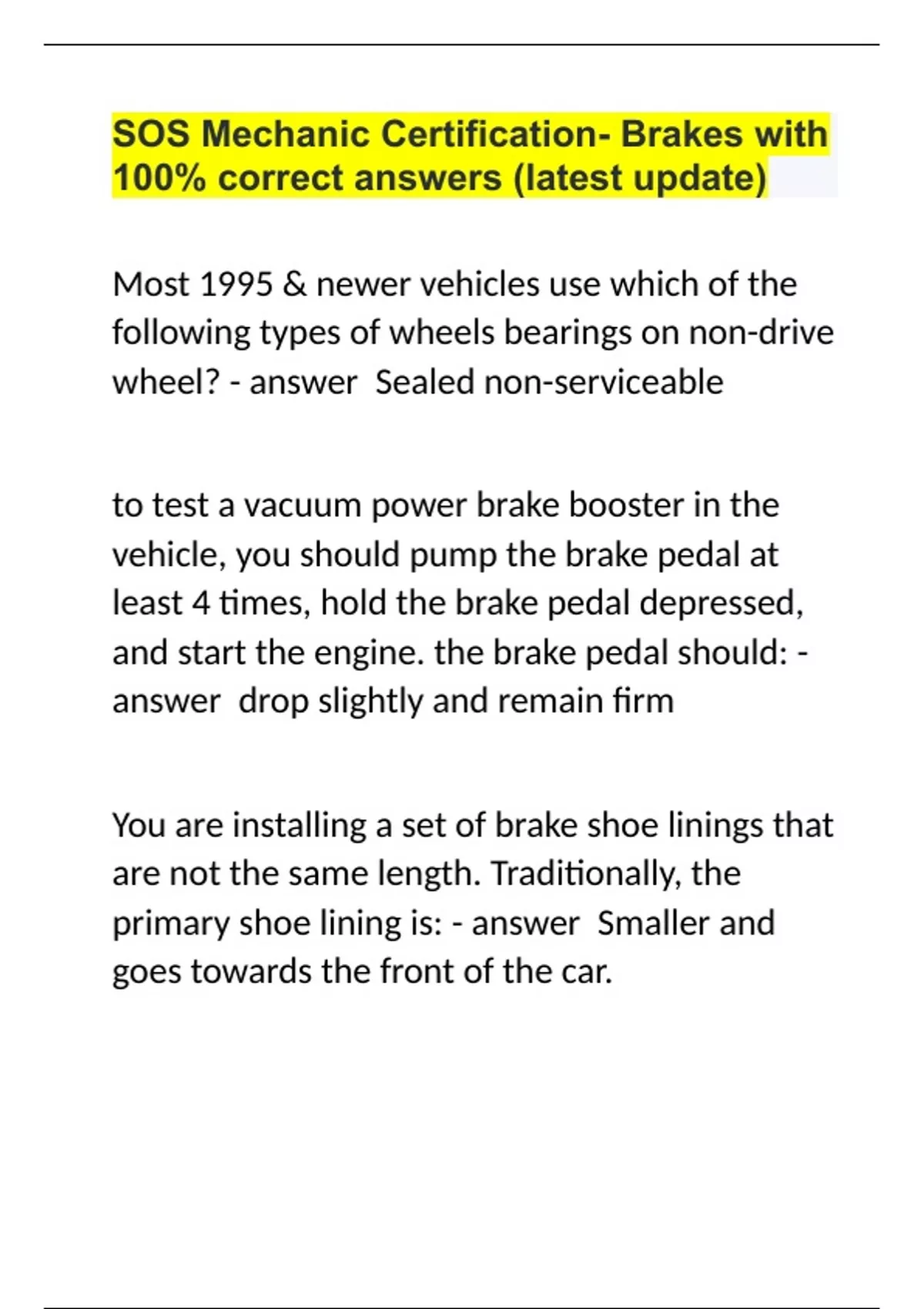 SOS Mechanic Certification- Brakes with 100% correct answers (latest update).