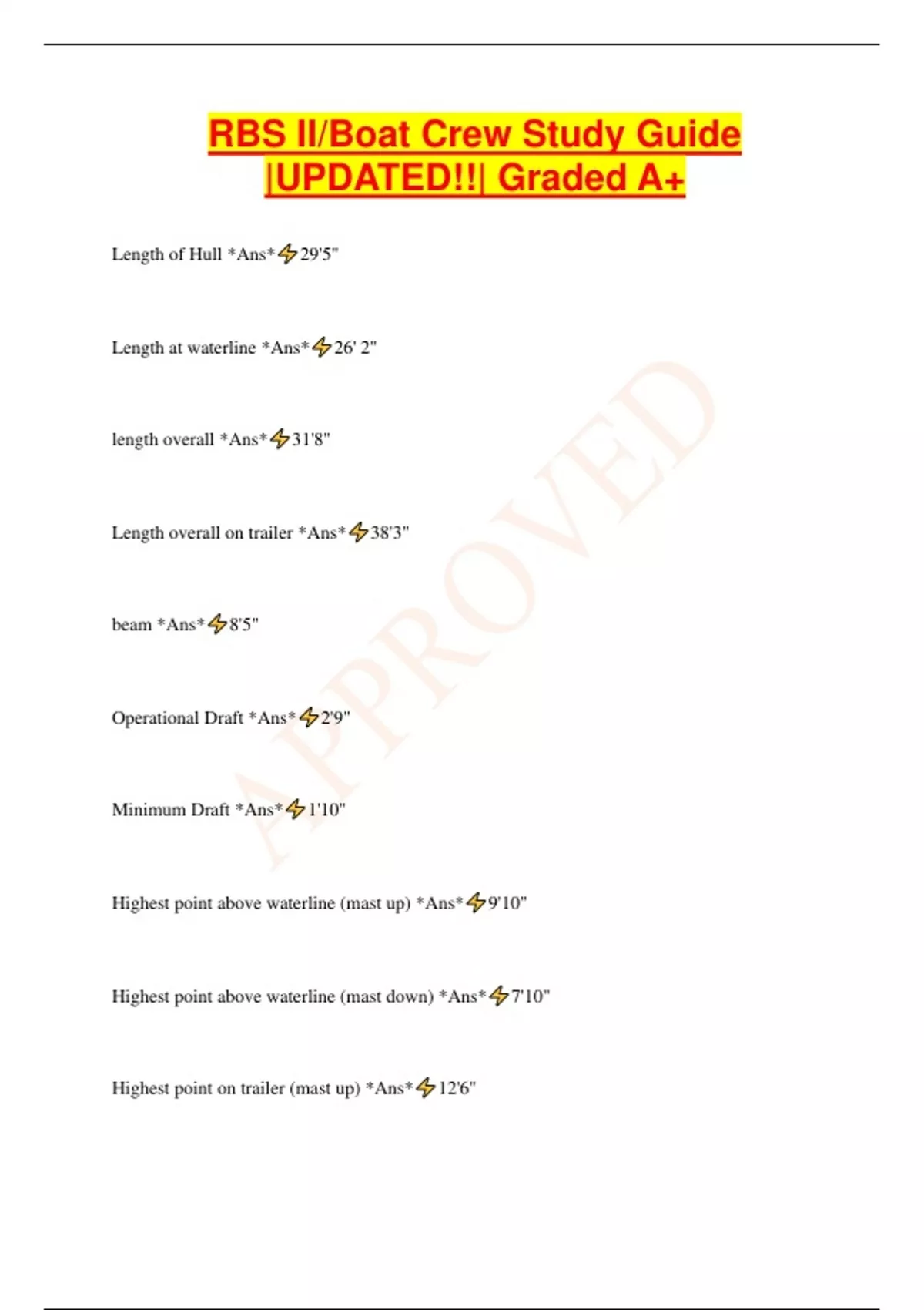 RBS II/Boat Crew Study Guide |UPDATED!!| Graded A+ Length of Hull *Ans* 29'5" Length at waterline *Ans* 26' 2" length overall *Ans* 31'8" Length overall on trailer *Ans* 38'3" beam *Ans* 8'5" Operational Draft *Ans* 2'9" Minimum Draft *Ans* 1'10" Highest point above waterline (mast up) *Ans* 9'10" Highest point above waterline (mast down) *Ans* 7'10" Highest point on trailer (mast up) *Ans* 12'6" Highest point on trailer (mast down) *Ans* 10'6" Total POB *Ans* 10 Gas tank capacity *Ans* 110 gallons Diesel Tank Capacity *Ans* 3.3 gallons Propellers *Ans* 15 3/8 X 18P, 3 blade propeller (counter rotating) Boat weight (fuel, no crew) *Ans* 8400 pounds Boat Max Weight (10 POB) *Ans* 11,800 lbs Trailering Weight (fully outfitted, fuel, trailer, no crew) *Ans* 9,960 lbs maximum speed *Ans* 45 kts at 6000 RPM cruising speed *Ans* 25 kts at 3250 rp