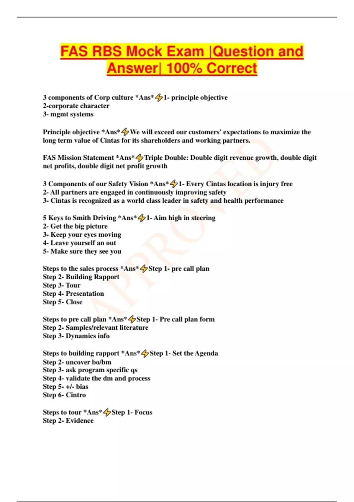 FAS RBS Mock Exam |Question and Answer| 100% Correct 3 components of Corp culture *Ans* 1- principle objective 2-corporate character 3- mgmt systems Principle objective *Ans* We will exceed our customers' expectations to maximize the long term value of Cintas for its shareholders and working partners. FAS Mission Statement *Ans* Triple Double: Double digit revenue growth, double digit net profits, double digit net profit growth 3 Components of our Safety Vision *Ans* 1- Every Cintas location is injury free 2- All partners are engaged in continuously improving safety 3- Cintas is recognized as a world class leader in safety and health performance 5 Keys to Smith Driving *Ans* 1- Aim high in steering 2- Get the big picture 3- Keep your eyes moving 4- Leave yourself an out 5- Make sure they see you Steps to the sales process *Ans* Step 1- pre call plan Step 2- Building Rapport Step 3- Tour Step 4- Presentation Step 5- Close Steps to pre call plan *Ans* Step 1- Pre call plan form Step 2- Samples/relevant literature Step 3- Dynamics info Steps to building rapport *Ans* Step 1- Set the Agenda Step 2- uncover bo/bm Step 3- ask program specific qs Step 4- validate the dm and process Step 5- +/- bias Step 6- Cintro Steps to tour *Ans* Step 1- Focus Step 2- Evidence Step 3- Agreement Step 4- PONC Step 5- Requirement Steps to Presentation *Ans* Step 1- Review requirements Step 2- Present Cintas Uniqueness Step 3- SAFE Steps to Close- *Ans* Step 1- Ask for business Step 2- Handle Objections Step 3- Referrals Sustained Success Model Components *Ans* New pres x cl