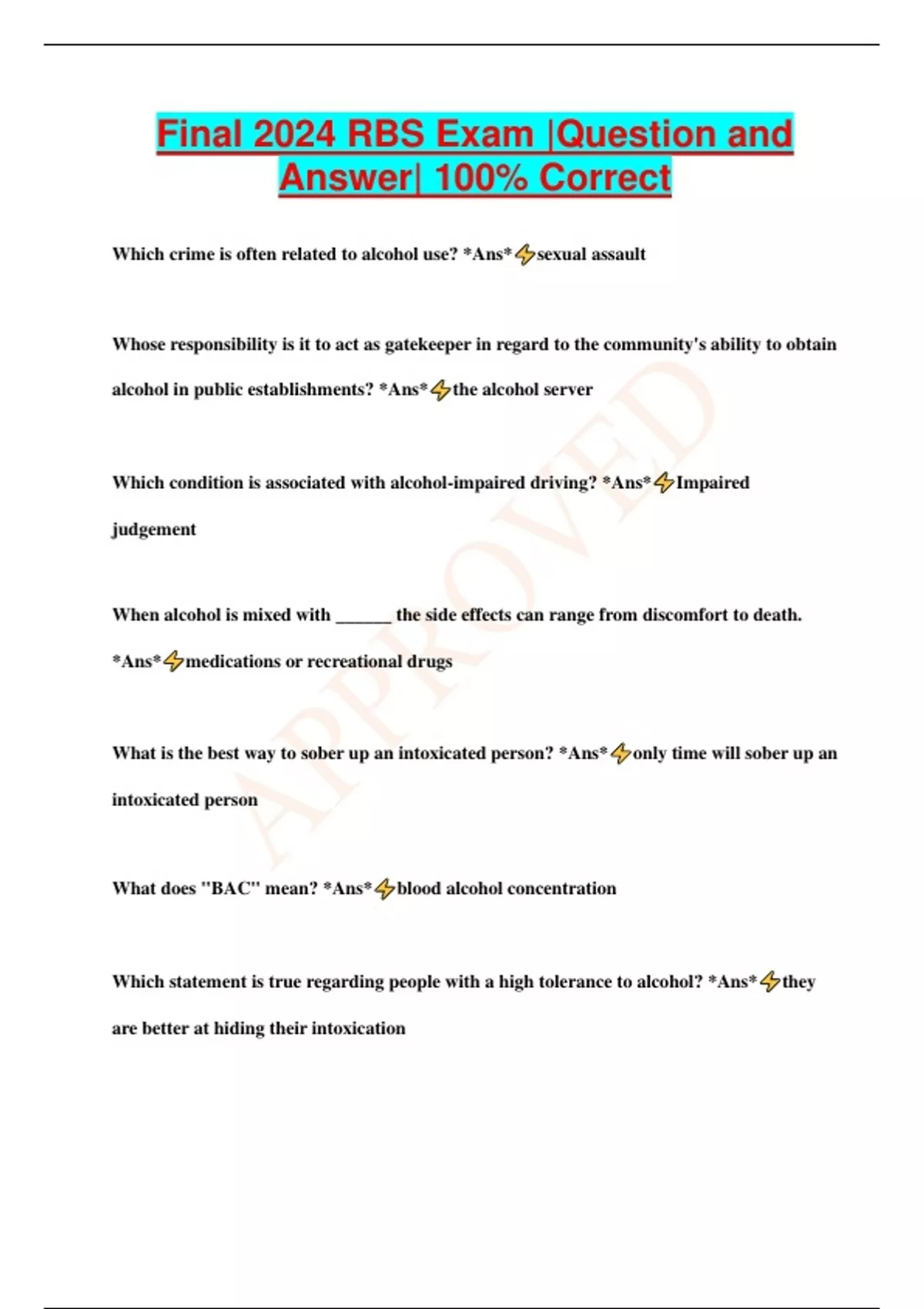 Final 2024 RBS Exam |Question and Answer| 100% Correct Which crime is often related to alcohol use? *Ans* sexual assault Whose responsibility is it to act as gatekeeper in regard to the community's ability to obtain alcohol in public establishments? *Ans* the alcohol server Which condition is associated with alcohol-impaired driving? *Ans* Impaired judgement When alcohol is mixed with ______ the side effects can range from discomfort to death. *Ans* medications or recreational drugs What is the best way to sober up an intoxicated person? *Ans* only time will sober up an intoxicated person What does "BAC" mean? *Ans* blood alcohol concentration Which statement is true regarding people with a high tolerance to alcohol? *Ans* they are better at hiding their intoxication Eating food while drinking alcohol may *Ans* slow down the rate of intoxication. The use of foul language is an example of *Ans* lowering inhibitions Which statement about alcohol's path through the human body is true? *Ans* no digestion is needed in alcohol absorption What is the primary purpose of ABC's T.R.A.C.E. program? *Ans* identify and investigate where persons under 21 years of age obtained alcohol and who was killed or obtained serious injury or accident It is unlawful for a person who has _____ percent or more, by weight, of al