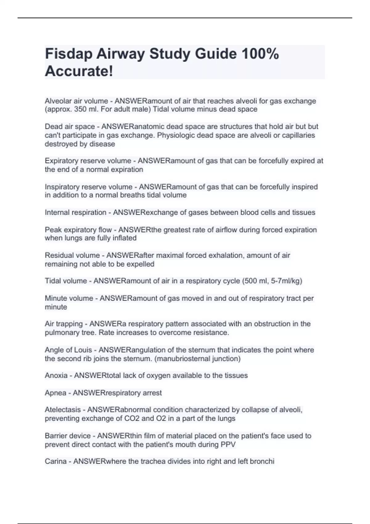 Alveolar air volume - ANSWERamount of air that reaches alveoli for gas exchange (approx. 350 ml. For adult male) Tidal volume minus dead space Dead air space - ANSWERanatomic dead space are structures that hold air but but can't participate in gas exchange. Physiologic dead space are alveoli or capillaries destroyed by disease Expiratory reserve volume - ANSWERamount of gas that can be forcefully expired at the end of a normal expiration Inspiratory reserve volume - ANSWERamount of gas that can be forcefully inspired in addition to a normal breaths tidal volume Internal respiration - ANSWERexchange of gases between blood cells and tissues Peak expiratory flow - ANSWERthe greatest rate of airflow during forced expiration when lungs are fully inflated Residual volume - ANSWERafter maximal forced exhalation, amount of air remaining not able to be expelled Tidal volume - ANSWERamount of air in a respiratory cycle (500 ml, 5-7ml/kg) Minute volume - ANSWERamount of gas moved in and out of respiratory tract per minute Air trapping - ANSWERa respiratory pattern associated with an obstruction in the pulmonary tree. Rate increases to overcome resistance.