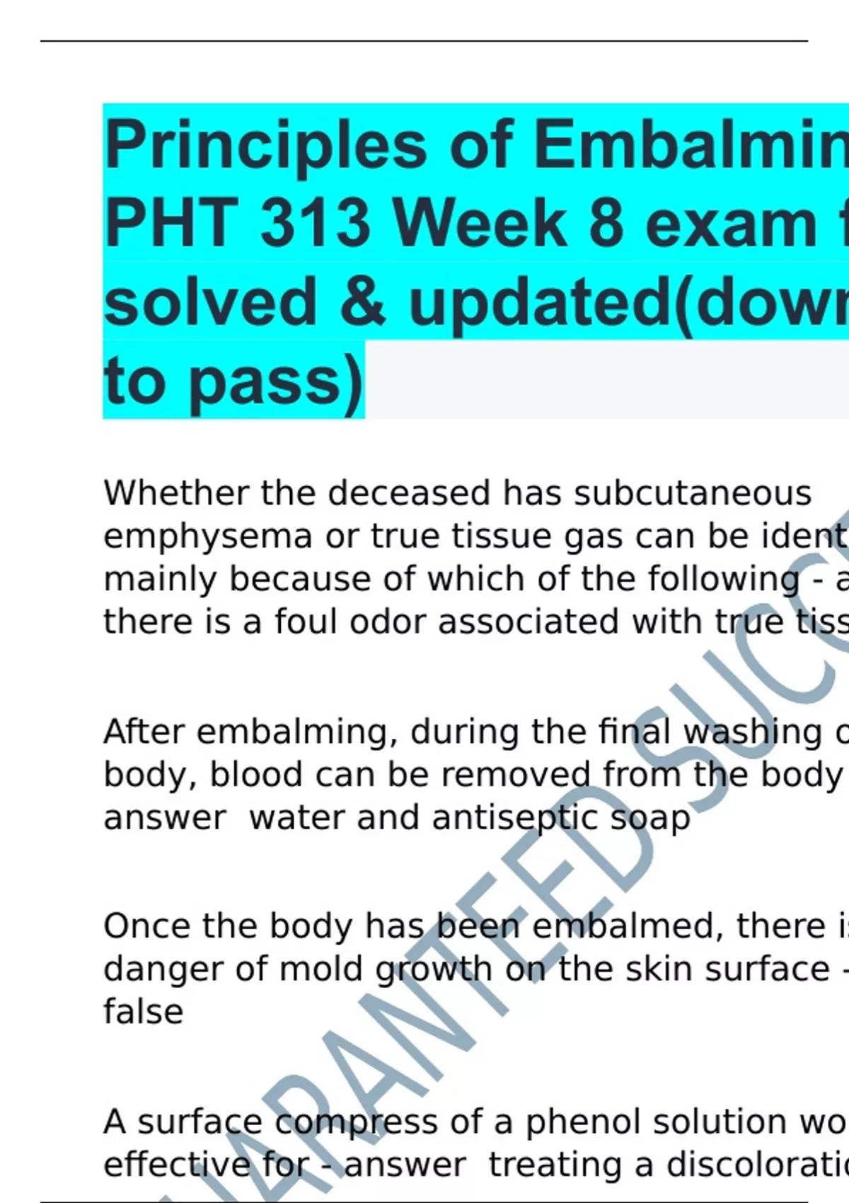 Principles of Embalming II - PHT 313 Week 8 exam fully solved & updated(download to pass)