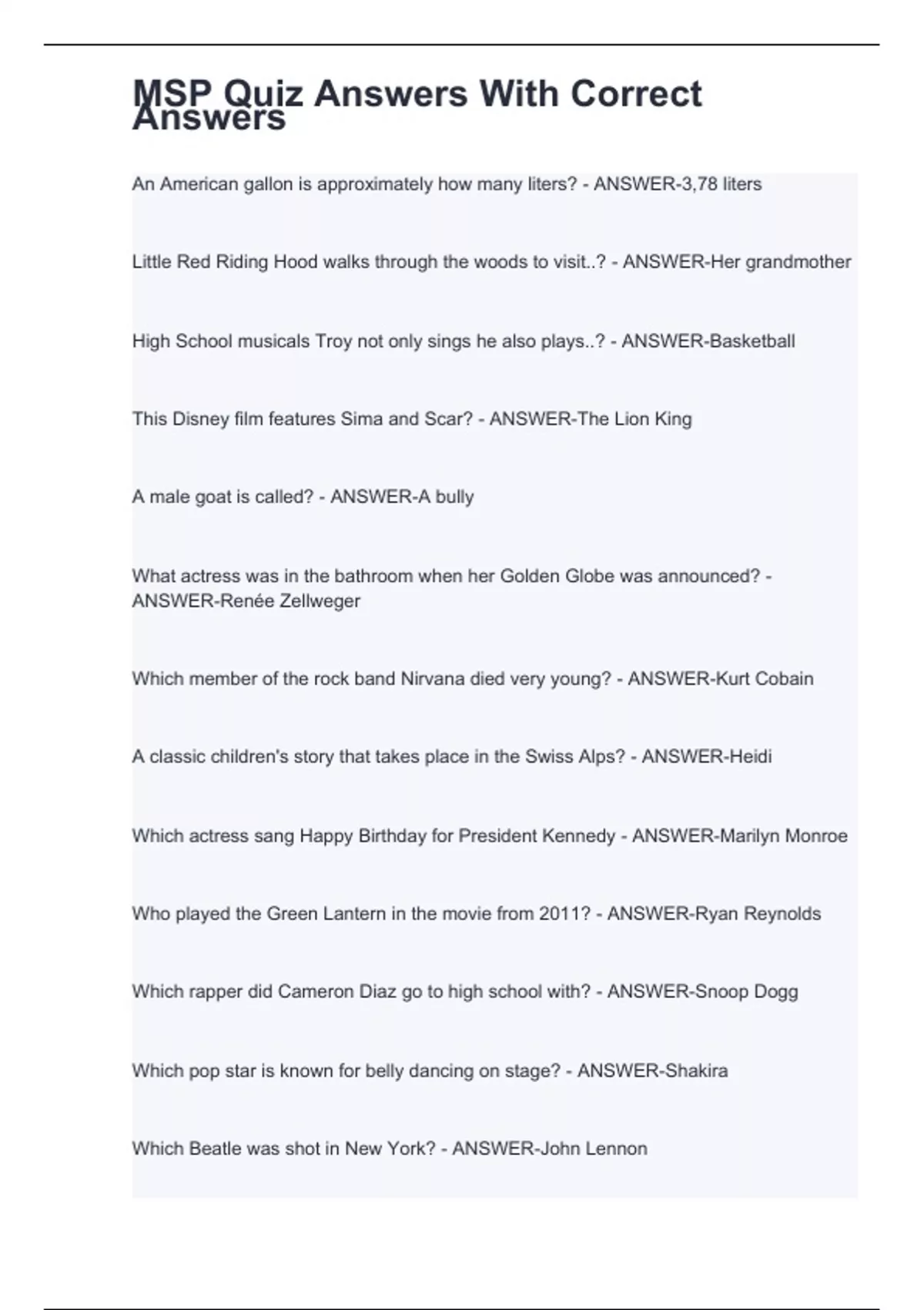 An American gallon is approximately how many liters? - ANSWER-3,78 liters Little Red Riding Hood walks through the woods to visit..? - ANSWER-Her grandmother High School musicals Troy not only sings he also plays..? - ANSWER-Basketball This Disney film features Sima and Scar? - ANSWER-The Lion King A male goat is called? - ANSWER-A bully What actress was in the bathroom when her Golden Globe was announced? - ANSWER-Renée Zellweger Which member of the rock band Nirvana died very young? - ANSWER-Kurt Cobain A classic children's story that takes place in the Swiss Alps? - ANSWER-Heidi Which actress sang Happy Birthday for President Kennedy - ANSWER-Marilyn Monroe Who played the Green Lantern in the movie from 2011? - ANSWER-Ryan Reynolds Which rapper did Cameron Diaz go to high school with? - ANSWER-Snoop Dogg Which pop star is known for belly dancing on stage? - ANSWER-Shakira