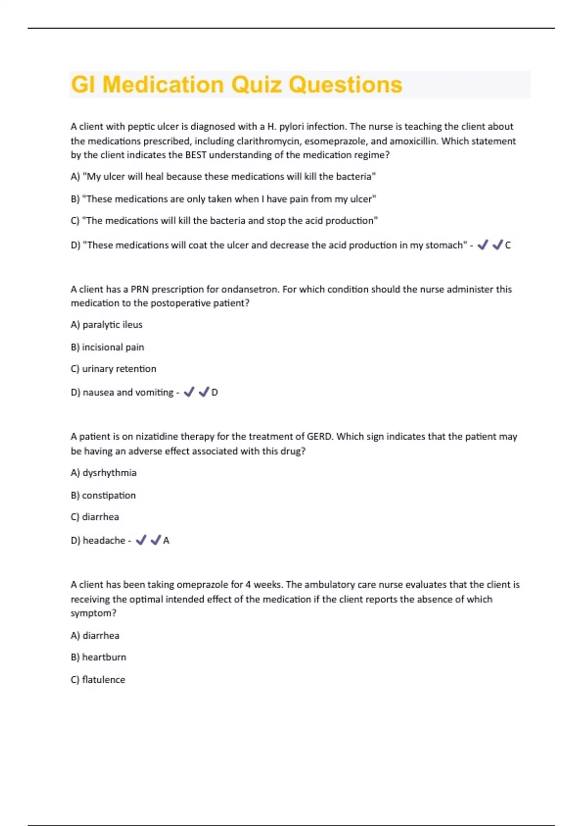 A client with peptic ulcer is diagnosed with a H. pylori infection. The nurse is teaching the client about the medications prescribed, including clarithromycin, esomeprazole, and amoxicillin. Which statement by the client indicates the BEST understanding of the medication regime? A) "My ulcer will heal because these medications will kill the bacteria" B) "These medications are only taken when I have pain from my ulcer" C) "The medications will kill the bacteria and stop the acid production" D) "These medications will coat the ulcer and decrease the acid production in my stomach" - C A client has a PRN prescription for ondansetron. For which condition should the nurse administer this medication to the postoperative patient? A) paralytic ileus B) incisional pain C) urinary retention D) nausea and vomiting - D A patient is on nizatidine therapy for the treatment of GERD. Which sign indicates that the patient may be having an adverse effect associated with this drug? A) dysrhythmia B) constipation C) diarrhea D) headache - A A client has been taking omeprazole for 4 weeks. The ambulatory care nurse evaluates that the client is receiving the optimal intended effect of the medication if the client reports the absence of which symptom? A) diarrhea B) heartburn C) flatulenceD) constipation - B A patient who has been prescribed metoclopramide is being discharged home. Which statement by the patient indicates a need for further discharge teaching by the nurse? A) "I will take the drug after meals" B) "I am using this drug to increase the rate at which my stomach empties" C) "I will call the health care provider if I have any ataxia" D) "I will inform the doctor if I start to have any hallucinations" - B A client has a PRN prescription for loperamide hydrochloride. For which condition should the nurse administer this medication? A) constipation B) abdominal pain C) an episode of diarrhea D) hematest-positive nasogastric tube drainage - C A client who chronically uses nonsteroidal anti-inflammatory drugs has been taking misoprostol. The nurse determines that the medication is having the intended therapeutic effect is which finding is noted? A) resolved diarrhea B) relief of epigastric pain C) decreased platelet count D) decreased white blood cell count - B A patient with acute gastritis is receiving treatment to block and buffer gastric acid secretions to relieve pain. Which drug does the nurse identify as an anti-secretory agent (proton pump inhibitor)? A) sucralfate B) ranitidine C) mylanta D) omeprazole - DWhich treatment is true about the drug rabeprazole for treatment of GERD? A) if is rapidly released into the body after it is administered B) the tablets are large and may be crushed if the patient has difficulty swallowing them C) it is a histamine receptor antagonist D) patients who use this drug should be instructed to wear sunscreen - D An older client recently has been taking cimetidine. The nurse monitors the client for which most frequent central nervous system side effect of this medication? A) tremors B) dizziness C) confusion D) hallucinations - D A client with Crohn's disease is scheduled to receive an infusion of infliximab. What intervention by the nurse will determine the effectiveness of treatment? A) monitoring the leukocyte count for 2 days after the infusion B) checking the frequency and consistency of bowel movements C) checking serum liver enzyme levels before and after the infusion D) carrying out a hematest on gastric fluids after the infusion is completed - A
