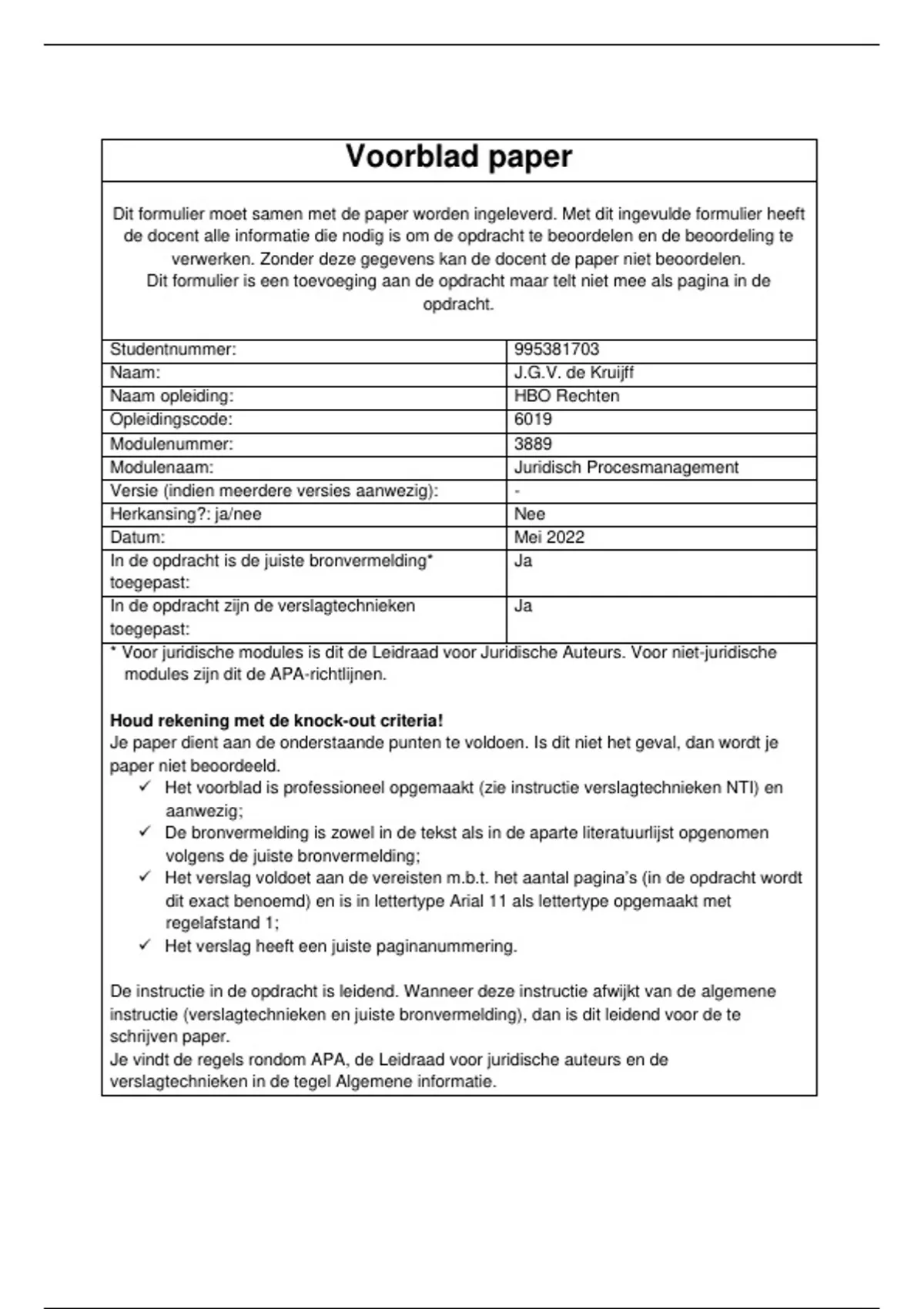 Voor u ligt mijn paper ter afronding van de module Juridisch procesmanagement. Ik wens u