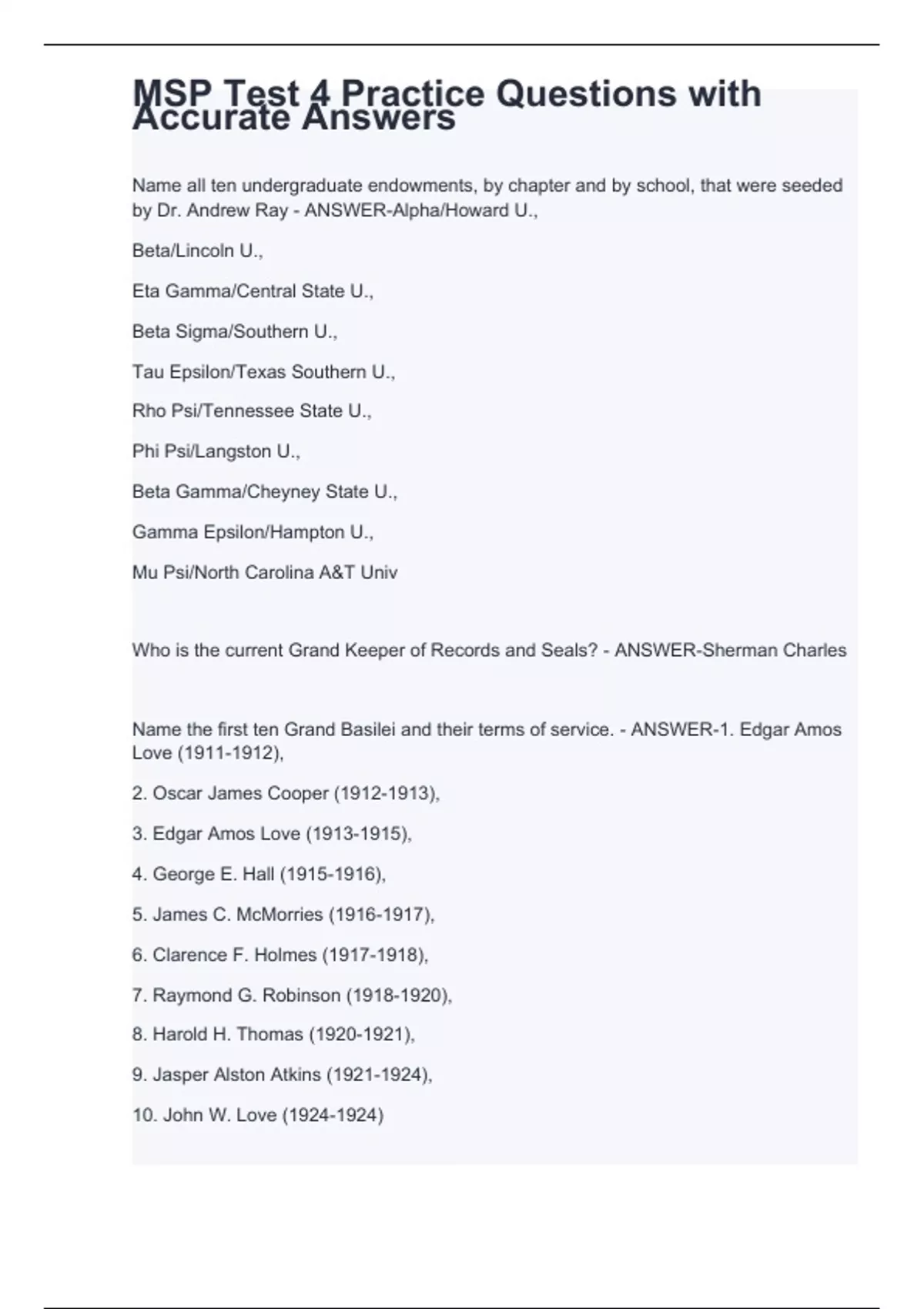 Name all ten undergraduate endowments, by chapter and by school, that were seeded by Dr. Andrew Ray - ANSWER-Alpha/Howard U., Beta/Lincoln U., Eta Gamma/Central State U., Beta Sigma/Southern U., Tau Epsilon/Texas Southern U., Rho Psi/Tennessee State U., Phi Psi/Langston U., Beta Gamma/Cheyney State U., Gamma Epsilon/Hampton U., Mu Psi/North Carolina A&T Univ Who is the current Grand Keeper of Records and Seals? - ANSWER-Sherman Charles Name the first ten Grand Basilei and their terms of service. - ANSWER-1. Edgar Amos Love (), 2. Oscar James Cooper (), 3. Edgar Amos Love (), 4. George E. Hall (), 5. James C. McMorries (), 6. Clarence F. Holmes (), 7. Raymond G. Robinson (), 8. Harold H. Thomas (), 9. Jasper Alston Atkins (), 10. John W. Love ()