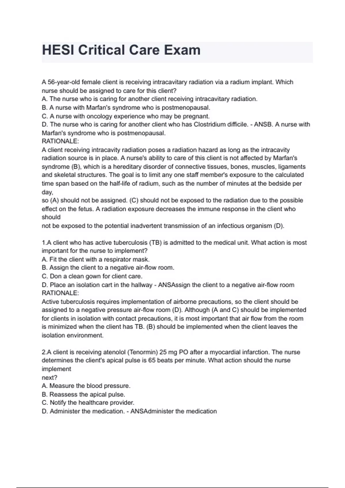 HESI Critical Care Exam questions and answers already graded A+ 2024/2025