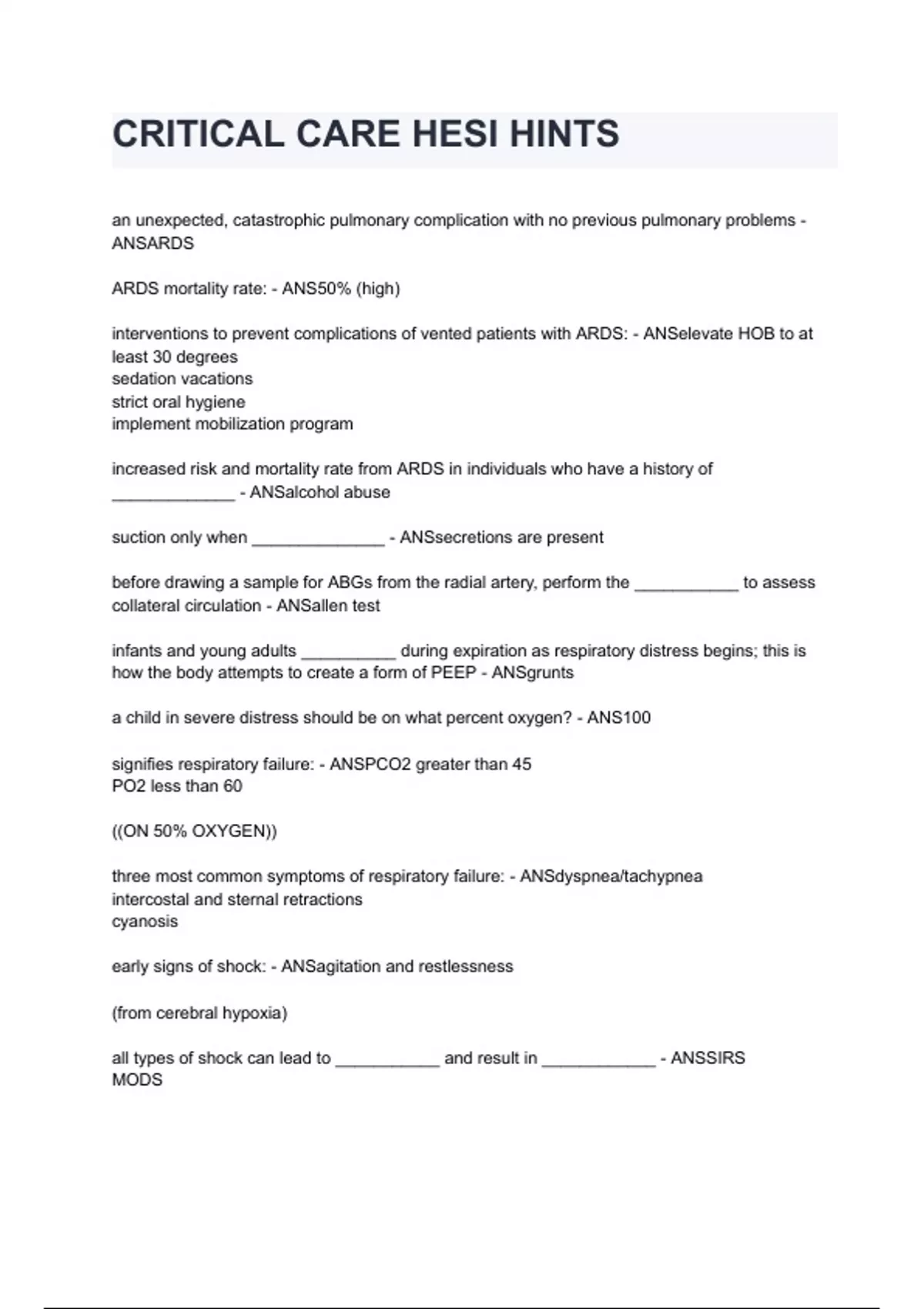 CRITICAL CARE HESI HINTS questions and answers already graded A+ 2024/2025