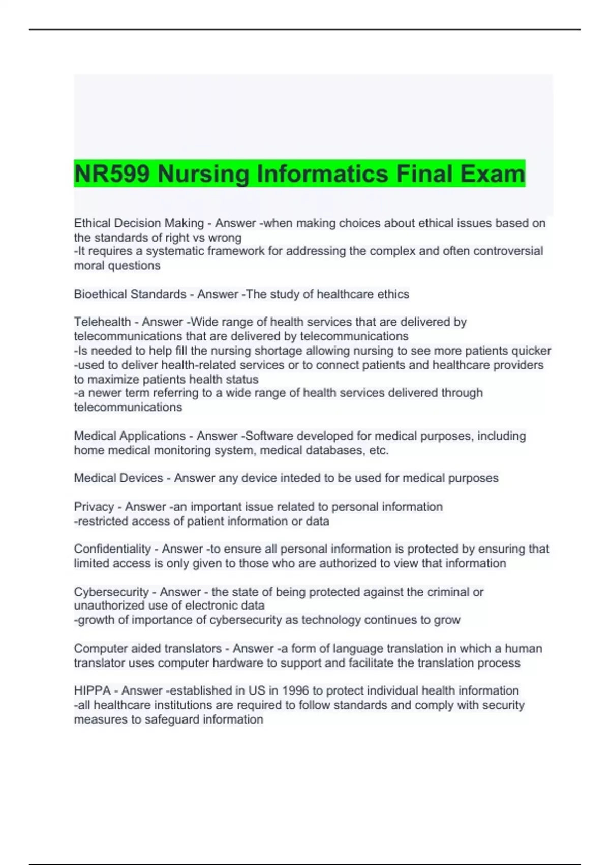 NR599 Nursing Informatics Final Exam Questions and Answers