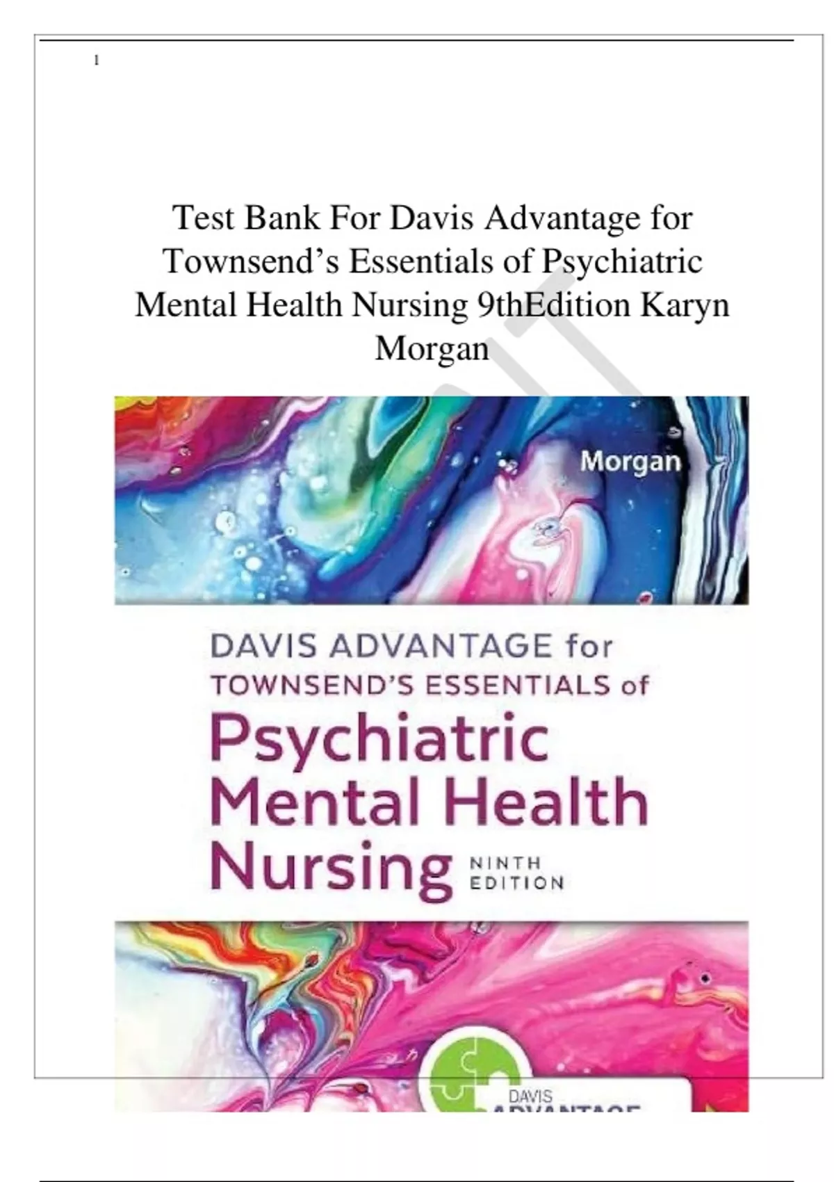 Test Bank For Davis Advantage for Townsend’s Essentials of Psychiatric Mental Health Nursing 9th Edition Karyn Morgan TEST BAN K Chapter 1. Mental Health and Mental Illness • A nurse is assessing a client who is experiencing occasional feelings of sadness because of therecent death of a beloved pet. The clients appetite, sleep patterns, and daily routine have not changed. How should the nurse interpret the clients behaviors? 1. The clients behaviors demonstrate mental illness in the form of depression. 2. The clients behaviors are extensive, which indicates the presence of mental illness. 3. The clients behaviors are not congruent with cultural norms. 4. The clients behaviors demonstrate no functional impairment, indicating no mental illness. ANS: 4 Rationale: The nurse should assess that the clients daily functioning is not impaired. The clientwho experiences feelings of sadness after the loss of a pet is responding within normal expectations. Without significant impairment, the clients distress does not indicate a mental illness. Cognitive Level: Analysis Integrated Process: Assessment • 2. At what point should the nurse determine that a client is at risk for developing a mentalillness? 1. When thoughts, feelings, and behaviors are not reflective of the DSM-5 criteria. 2. When maladaptive responses to stress are coupled with interference in daily functioning. 3. When a client communicates significant distress. 4. When a client uses defense mechanisms as ego protection. ANS: 2 Rationale: The nurse should determine that the client is at risk for mental illness when responsesto stress are maladaptive and interfere with daily functioning. The DSM-5 indicates that in orderto be diagnosed with a mental illness, daily functioning must be significantly impaired. The clients ability to communicate distress would be considered a positive attribute. Cognitive Level: Application Integrated Process: Assessment 3. A nurse is assessing a set of 15-year-old identical twins who respond very differently to stress.One twin becomes anxious and irritable, and the other withdraws and cries. How should the nurse explain these different stress responses to the parents? i. Reactions to stress are relative rather than absolute; individual responses to stress vary. ii. It is abnormal for identical twins to react differently to similar stressors. iii. Identical twins should share the same temperament and respond similarly to stress. iv. Environmental influences to stress weigh more heavily than genetic influences. ANS: 1 Rationale: The nurse should explain to the parents that, although the twins have identical DNA,there are several other factors that affect reactions to stress. Mental health is a state of being thatis relative to the individual client. Environmental influences and temperament can affect stress reactions. Cognitive Level: Application Integrated Process: Implementation 4. Which client should the nurse anticipate to be most receptive to psychiatric treatment? i. A Jewish, female social worker. ii. A Baptist, homeless male. iii. A Catholic, black male. iv. A Protestant, Swedish business executive. ANS: 1 Rationale: The nurse should anticipate that the client of Jewish culture would place a high importance on preventative health care and would consider mental health as equally important asphysical health. Women are also more likely to seek treatment for mental health problems than men. Cognitive Level: ApplicationIntegrated Process: Planning v. A psychiatric nurse intern states, This clients use of defense mechanisms should be eliminated.Which is a correct evaluation of this nurses statement? 1. Defense mechanisms can be appropriate responses to stress and need not be eliminated. 2. Defense mechanisms are a maladaptive attempt of the ego to manage anxiety and shouldalways be eliminated. 3. Defense mechanisms, used by individuals with weak ego integrity, should be discouraged andnot eliminated. 4. Defense mechanisms cause disintegration of the ego and should be fostered and encouraged.