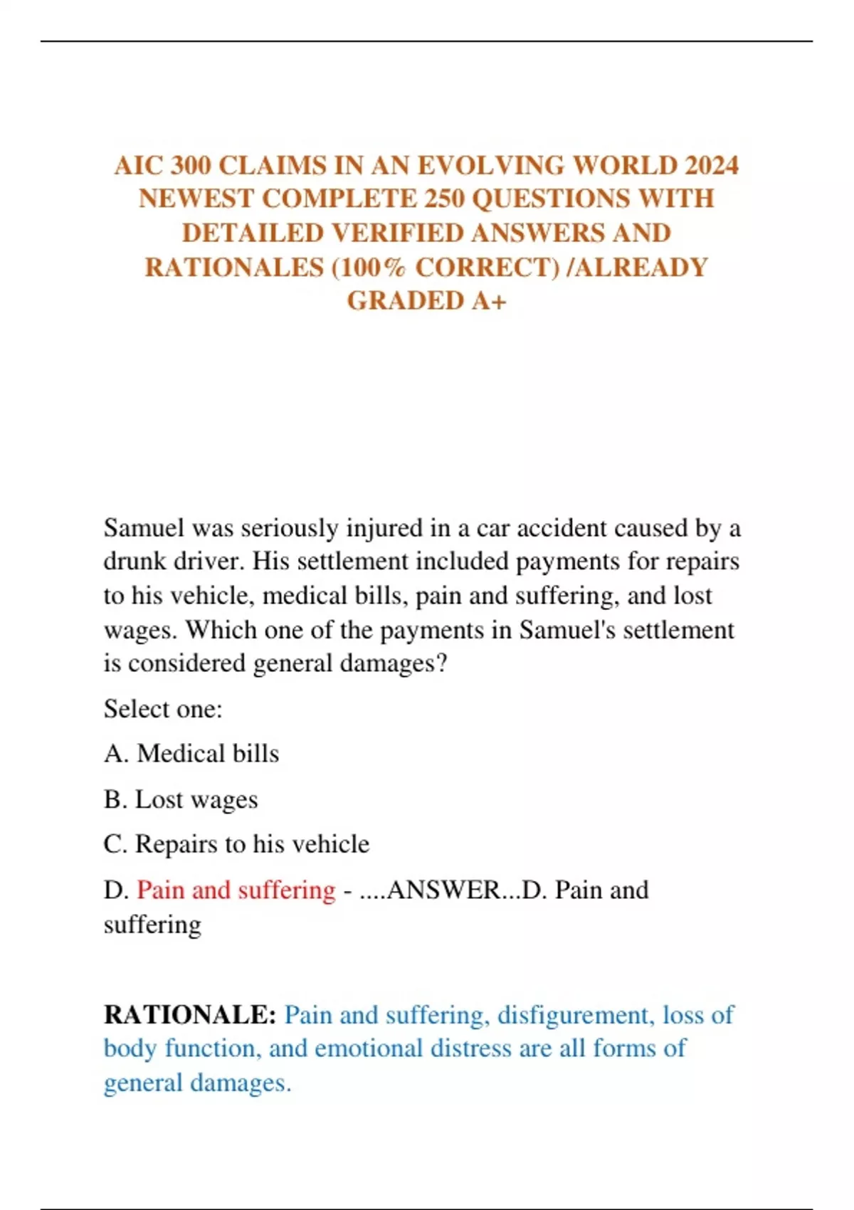 AIC 300 CLAIMS IN AN EVOLVING WORLD 2024 NEWEST COMPLETE 250 QUESTIONS WITH DETAILED VERIFIED ANSWERS AND RATIONALES (100% CORRECT) /ALREADY GRADED A+