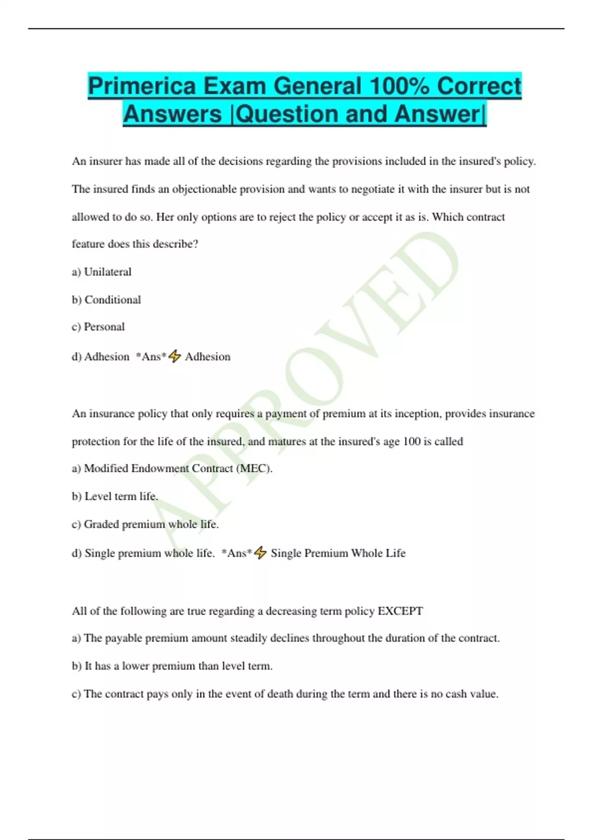 Primerica Exam General 100% Correct Answers |Question and Answer| An insurer has made all of the decisions regarding the provisions included in the insured's policy. The insured finds an objectionable provision and wants to negotiate it with the insurer but is not allowed to do so. Her only options are to reject the policy or accept it as is. Which contract feature does this describe? a) Unilateral b) Conditional c) Personal d) Adhesion *Ans* Adhesion An insurance policy that only requires a payment of premium at its inception, provides insurance protection for the life of the insured, and matures at the insured's age 100 is called a) Modified Endowment Contract (MEC). b) Level term life. c) Graded premium whole life. d) Single premium whole life. *Ans* Single Premium Whole Life All of the following are true regarding a decreasing term policy EXCEPT a) The payable premium amount steadily declines throughout the duration of the contract. b) It has a lower premium than level term. c) The contract pays only in the event of death during the term and there is no cash value. d) The face amount steadily declines throughout the duration of the contract. *Ans* The payable premium amount steadily declines throughout the duration of the contract The type of policy that can be changed from one that does not accumulate cash value to the one that does, is a a) Decreasing Term Policy. b) Whole Life Policy. c) Convertible Term Policy. d) Renewable Term Policy. *Ans* Convertible Term Policy The policyowner of an adjustable life policy wants to increase the death benefit. Which of the following statements is correct regarding this change? a) The death benefit can be increased by providing evidence of insurability. b) The death benefit cannot be increased. c) The death benefit can be increased only when the policy has developed a cash value. d) The death benefit can be increased only by exchanging the existing policy for a new one. *Ans* The death benefit can be increased by providing evidence of insurability When would a 20-pay whole life policy endow? a) After 20 payments b) In 20 years c) When the insured reaches age 100 d) At the insured's age 65 *Ans* When the insured reaches age 100 An insured had a $10,000 term life policy. The annual premium of $200 was due on February 1; however, the insured failed to pay the premium. He died on February 28. How much would the beneficiary receive from the policy? a) $0 b) $200 c) $9,800 d) $10,000 *Ans* $9,800 What is the term for how frequently a policyowner is required to pay the policy premium? a) Consideration b) Mode c) Schedule d) Grace period *Ans* Mode Which of the following types of insurance policies would perform the function of cash