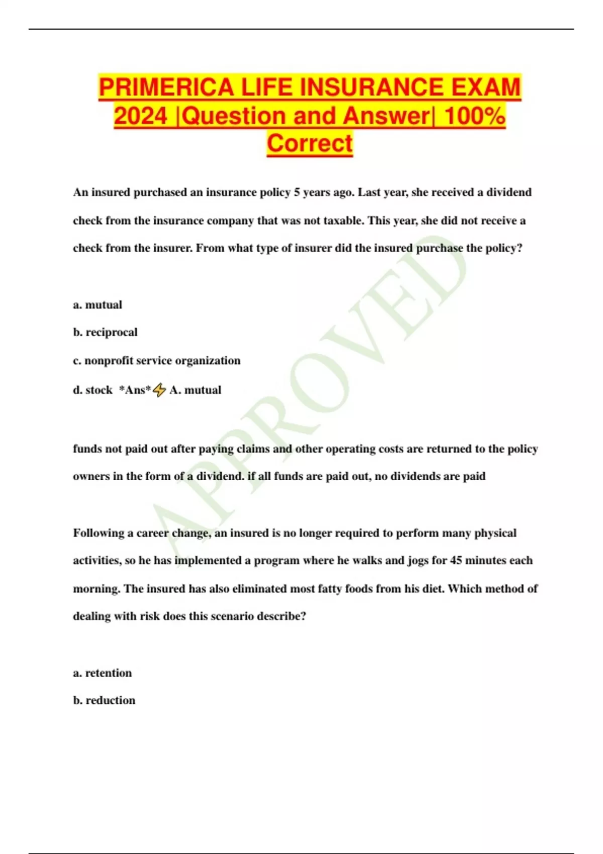 PRIMERICA LIFE INSURANCE EXAM 2024 |Question and Answer| 100% Correct An insured purchased an insurance policy 5 years ago. Last year, she received a dividend check from the insurance company that was not taxable. This year, she did not receive a check from the insurer. From what type of insurer did the insured purchase the policy? a. mutual b. reciprocal c. nonprofit service organization d. stock *Ans* A. mutual funds not paid out after paying claims and other operating costs are returned to the policy owners in the form of a dividend. if all funds are paid out, no dividends are paid Following a career change, an insured is no longer required to perform many physical activities, so he has implemented a program where he walks and jogs for 45 minutes each morning. The insured has also eliminated most fatty foods from his diet. Which method of dealing with risk does this scenario describe? a. retention b. reduction c. transfer d. avoidance *Ans* B. reduction the insured's change in lifestyle and habits would likely reduce the chances of health problems In insurance, an offer is usually made when a. an applicant submits an application to the insurer b. the insurer approves the application and receives the initial premium c. the agent hands the policy to the policyholder d. an agent explains a policy to a potential applicant *Ans* A. an applicant submits an application to the insurer in insurance, the offer is usually made by the applicant in the form of an application. acceptance takes place when an insurer's underwriter approves the application and issues a policy the causes of loss insured against in an insurance policy are known as a. perils b. losses c. risks d. hazards *Ans* A. perils perils are the causes of loss insured against in an insurance policy what documentation grants express authority to an agent? a. agents contract with the principal b. agents insurance license c. fiduciary contract d. state provisions *Ans* A. agents contract with the principal
