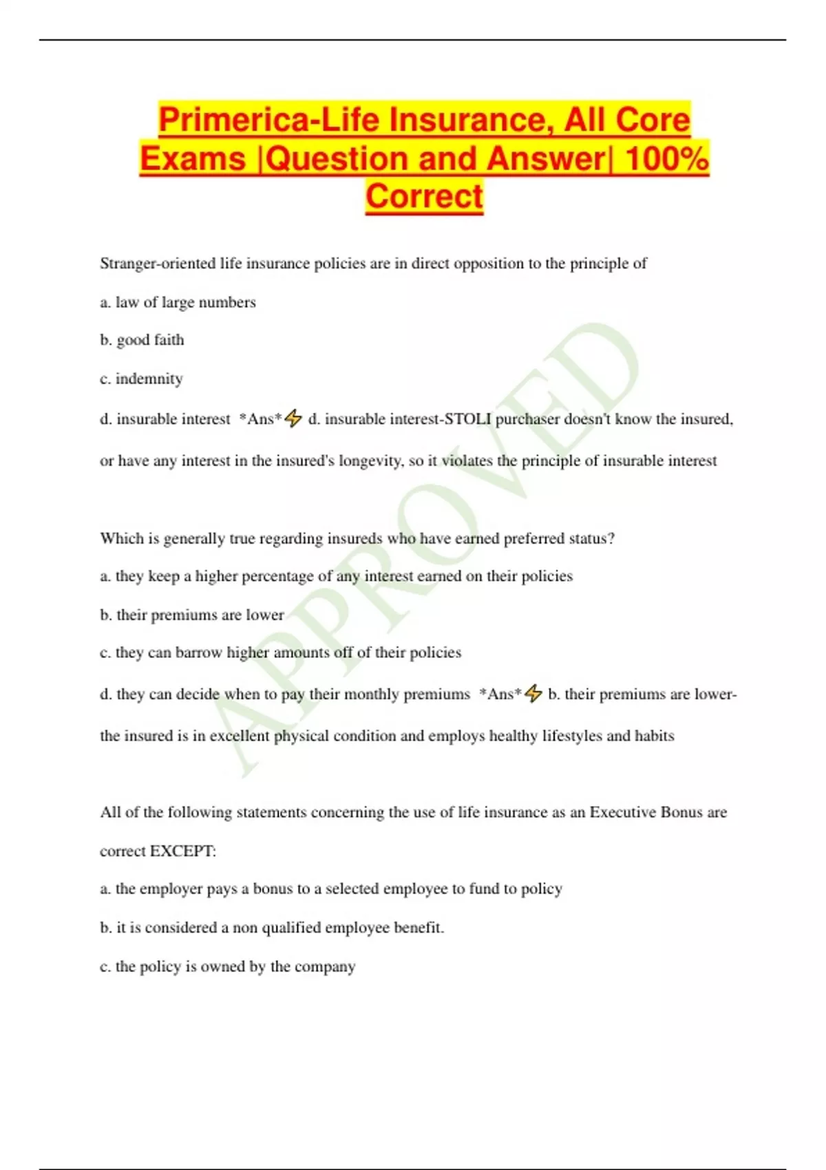 Primerica-Life Insurance, All Core Exams |Question and Answer| 100% Correct Stranger-oriented life insurance policies are in direct opposition to the principle of a. law of large numbers b. good faith c. indemnity d. insurable interest *Ans* d. insurable interest-STOLI purchaser doesn't know the insured, or have any interest in the insured's longevity, so it violates the principle of insurable interest Which is generally true regarding insureds who have earned preferred status? a. they keep a higher percentage of any interest earned on their policies b. their premiums are lower c. they can barrow higher amounts off of their policies d. they can decide when to pay their monthly premiums *Ans* b. their premiums are lowerthe insured is in excellent physical condition and employs healthy lifestyles and habits All of the following statements concerning the use of life insurance as an Executive Bonus are correct EXCEPT: a. the employer pays a bonus to a selected employee to fund to policy b. it is considered a non qualified employee benefit. c. the policy is owned by the company d. any type of insurance policy may be used. *Ans* c. the policy is owned by the company. An insured receives a monthly summary for his life insurance policy. He notices that the cash value of the policy is significantly lower this month than it was last month. What type of policy does the insured have? a. variable b. term c. securities d. stock *Ans* a. variable- life policies vary in value, as the name suggests, because the value is based on the stocks that support the policy. If a policyholder wants a more stable, reliable value, he/she should invest in a fixed policy. When an employer offers to give an employee a wage increase in the amount of the premium on a new life insurance policy, this is called a. aleatory contract b. executive bonus c. key person d. a fraternal association *Ans* b. executive bonus In terms of Social Security, what is the interval spanning between the day when the youngest child of a family turns 16 and before the surviving spouse may receive retirement benefits? *Ans* Blackout period- begins when the youngest child reaches the age of 16, and ends when the surviving spouse qualifies for retirement benefits, as early as age 60. No benefits are paid during this time. Life insurance may be used to pay state inheritance taxes and federal estate taxes so that it is not necessary to sell off assets from the estate to pay these costs. This is called a. estate conservation b. estate creation c. survivor protection d. survivorship insurnce *Ans* a. estate conservation- life insurance may be used to pay state inheritance taxes and federal estate taxes so that it is not necessary to sell off assets from the estate to pay these costs. This is called estate conservation. Which of the following applicants could the insurer charge a higher rate and not be charge with unfair discrimination? a. an applicant that was born in another country b. an applicant who is legally blind c. an applicant who has been a victim of domestic abuse d. an applicant that smokes cigarettes as opposed to one that does not *Ans* d. an applicant that smokes cigarettes as opposed to one that does not Partner A in a business buys a life insurance policy on Partner B to protect herself against a financial loss if he should die. Two years after the partnership is dissolved Partner B dies. Who will receive the death benefit? *Ans* Partner A Which of the following is NOT a type of information that needs to be gathered in order to determine the value of someone's life when using the needs approach? a. mortgages b. expenses c. estimated longevity d. outstanding debt *Ans* c. estimated longevity An employee will be taxed on the cost of group life insurance paid by the employer if the amount of coverage exceeds a. $10,000 b. $15,000 c. $25,000 d. $50,000 *Ans* d. $50,000 Which of the following would NOT fall into the category of costs associated with death? a. final medical expenses of the insured b. day to day expenses of maintaining the family c. the expense of a vacation for surviving family members d. funeral expenses *Ans* c. the expense of a vacation for surviving family members Based on Human Life Value Approach, which of the following is NOT used to calculate an individual's life value?