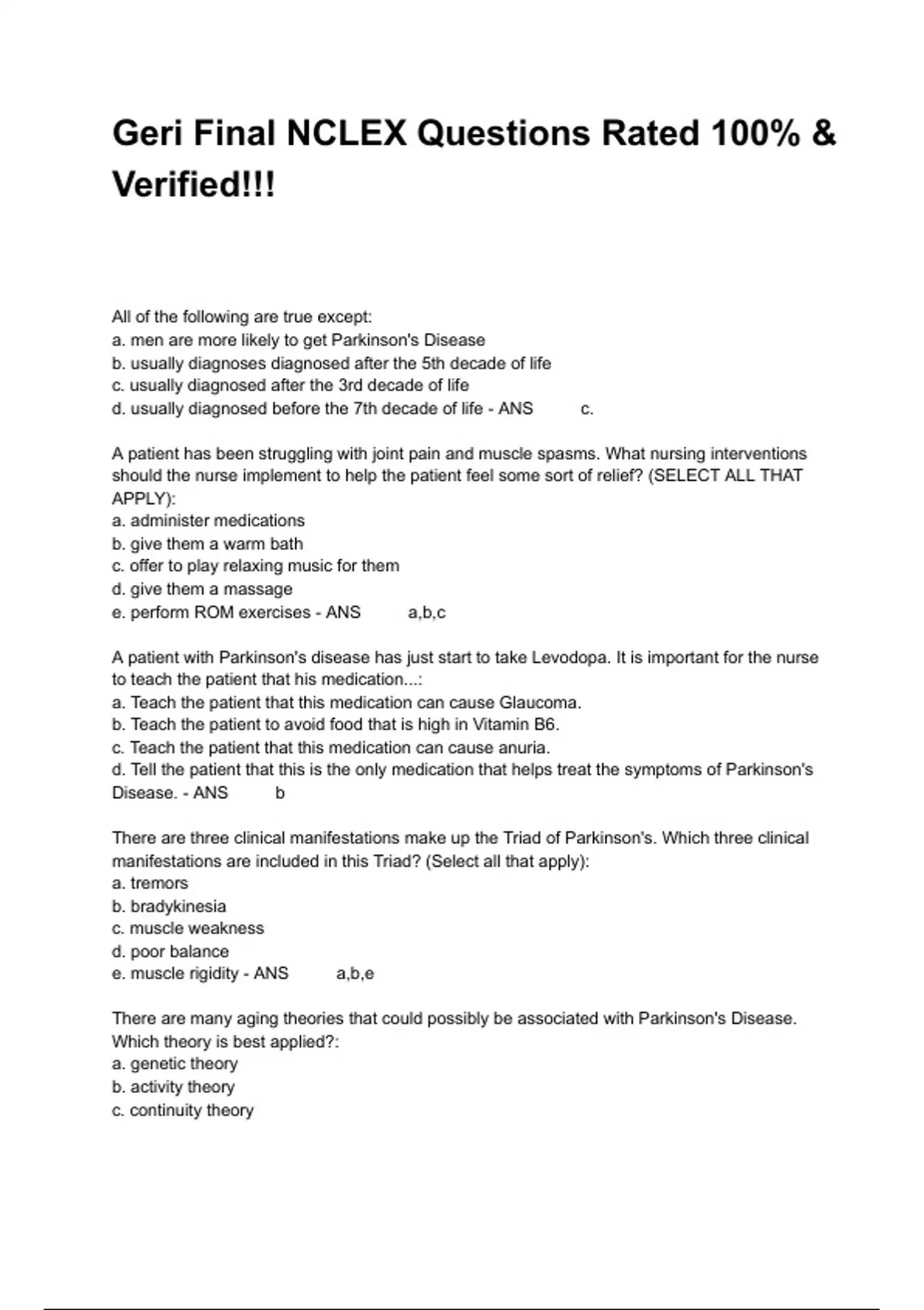 All of the following are true except: a. men are more likely to get Parkinson's Disease b. usually diagnoses diagnosed after the 5th decade of life c. usually diagnosed after the 3rd decade of life d. usually diagnosed before the 7th decade of life - ANS c. A patient has been struggling with joint pain and muscle spasms. What nursing interventions should the nurse implement to help the patient feel some sort of relief? (SELECT ALL THAT APPLY): a. administer medications b. give them a warm bath c. offer to play relaxing music for them d. give them a massage e. perform ROM exercises - ANS a,b,c A patient with Parkinson's disease has just start to take Levodopa. It is important for the nurse to teach the patient that his medication...: a. Teach the patient that this medication can cause Glaucoma. b. Teach the patient to avoid food that is high in Vitamin B6. c. Teach the patient that this medication can cause anuria. d. Tell the patient that this is the only medication that helps treat the symptoms of Parkinson's Disease. - ANS b There are three clinical manifestations make up the Triad of Parkinson's. Which three clinical manifestations are included in this Triad? (Select all that apply): a. tremors b. bradykinesia c. muscle weakness d. poor balance e. muscle rigidity - ANS a,b,e There are many aging theories that could possibly be associated with Parkinson's Disease. Which theory is best applied?: a. genetic theory b. activity theory c. continuity theory d. wear and tear theory - ANS d There many treatment options that can be used to help manage the symptoms of Parkinson's. All of the following are commonly used except...: a. nutritional therapy b. physical/occupational therapy c. radiation therapy d. surgical intervention - ANS c Which of the following are nursing considerations for spinal stenosis? SATA: a. ice pack after exercise b. heat after exercise c. massage d. medication for pain e. repositioning the patient - ANS all What is the first thing a nurse would do for a patient with spinal stenosis?: a. Assess the patient b. Call the doctor and prepare for surgery c. Educate the patient on the importance of therapy d. Give the patient pain medication - ANS a What manifestations would be present in severe spinal stenosis? SATA: a. loss of bowel and bladder function b. pain c. weakness or loss of feelings in one or both legs d. high temperature e. severe bleeding - ANS a,b,c You have 4 patients who require attention; Which one would you delegate to a patient care tech?: a. A 94-year old female who is 2-days post-op for a right hip arthroplasty complaining of pain in her right thigh b. Discharge teaching of a 75-year old male for spinal stenosis c. Administer routine medications to a 82-year old patient e. A 68-year old patient female with a new colles fracture from falling, who needs to use the restroom - ANS d With the same patients as above, which one would you prioritize?: a. A 94-year old female who is 2-days post-op for a right hip arthroplasty complaining of pain in her right thigh b. Discharge teaching of a 75-year old male for spinal stenosis c. Administer routine medications to a 82-year old patient d. A 68-year old patient female with a new colles fracture from falling, who needs to use the restroom - ANS a What is not a manifestation of a hip fracture? a. pain b. comfortable bearing weight c. abnormal placement of the hip d. bruising - ANS b